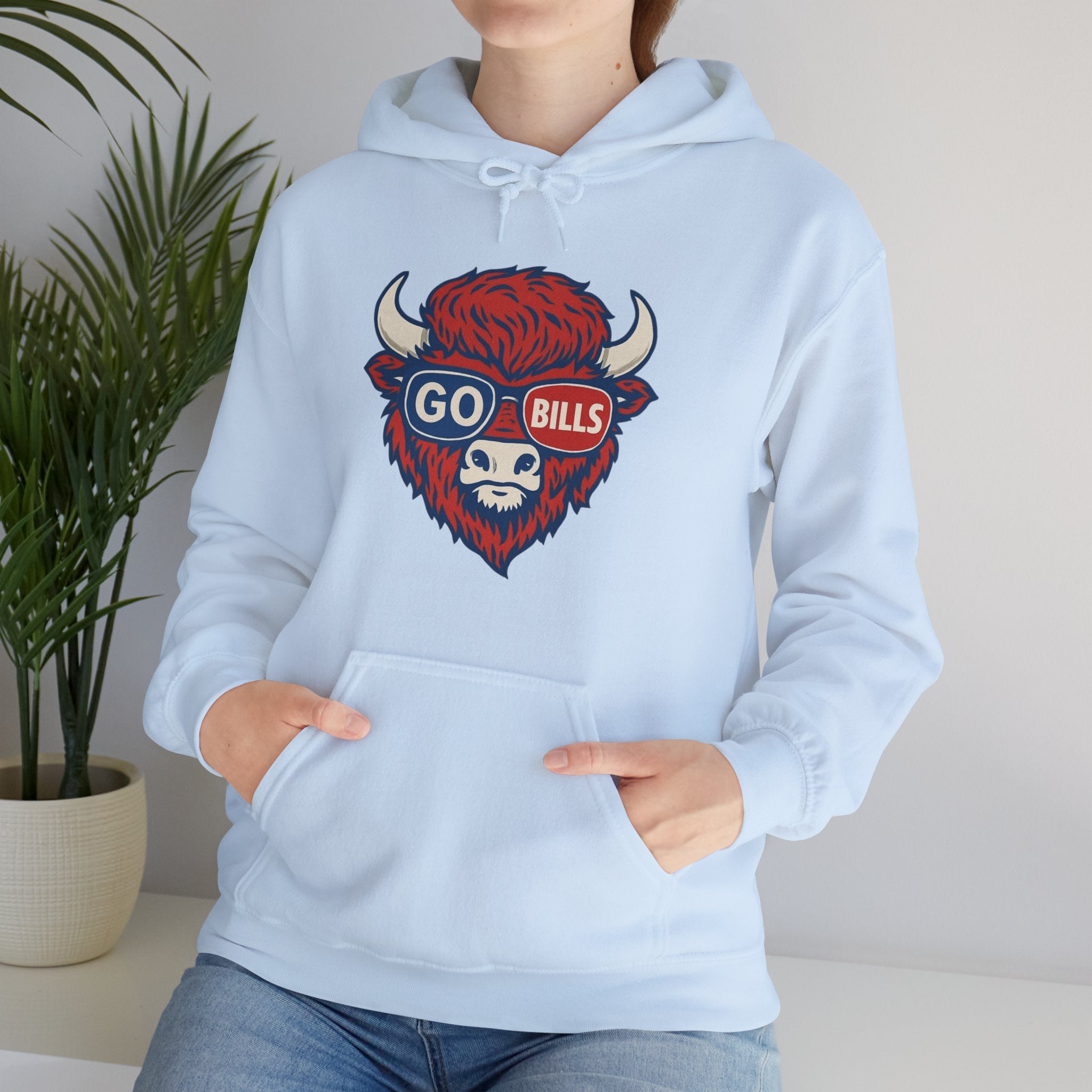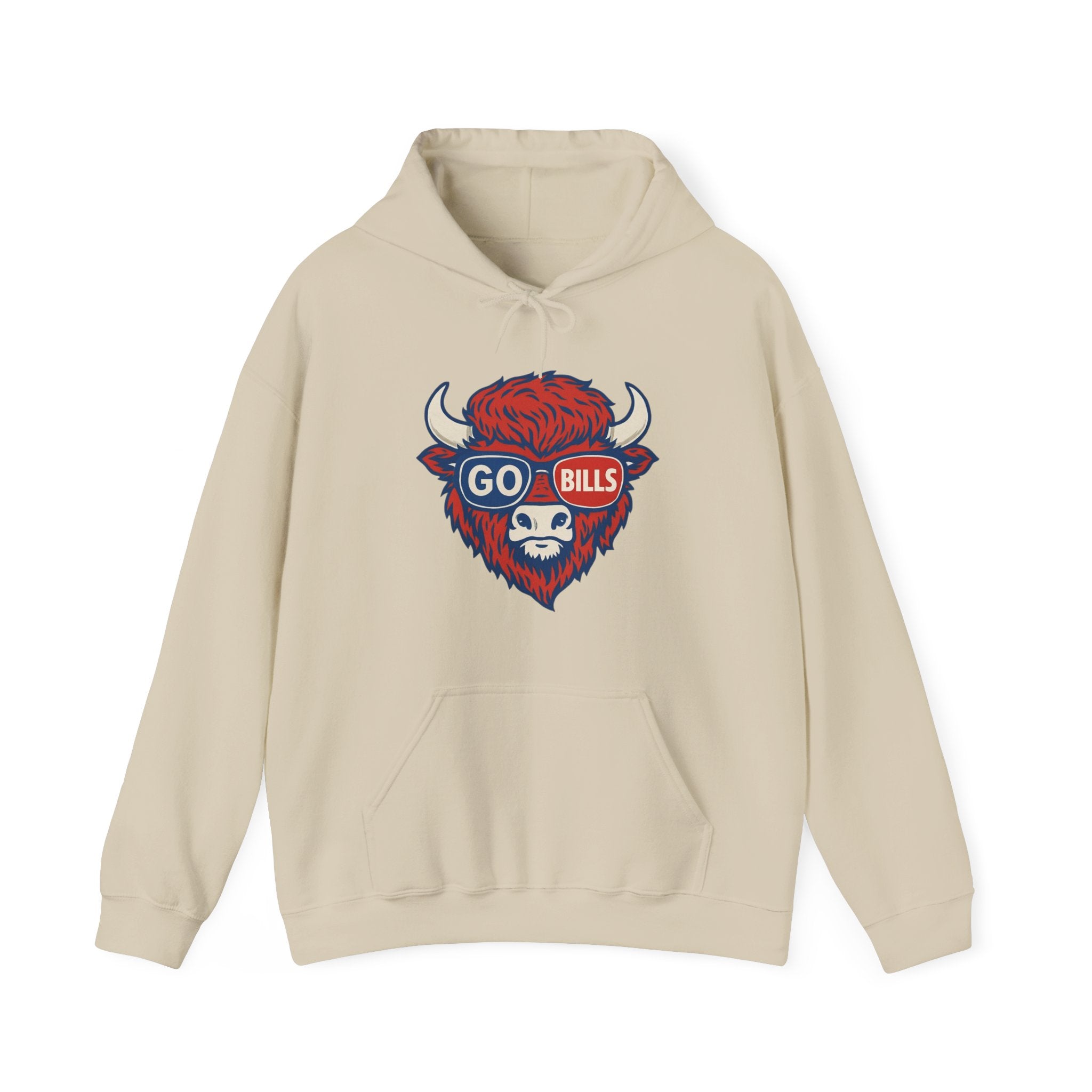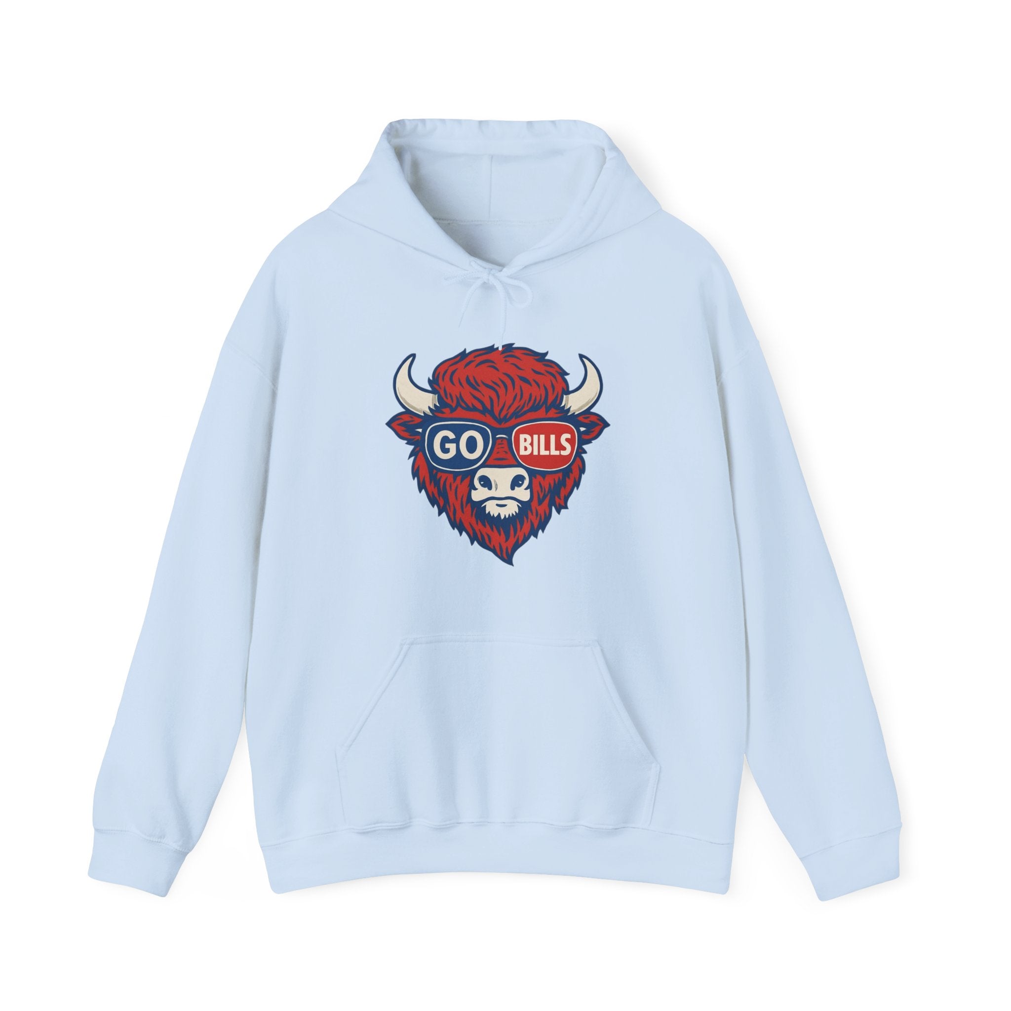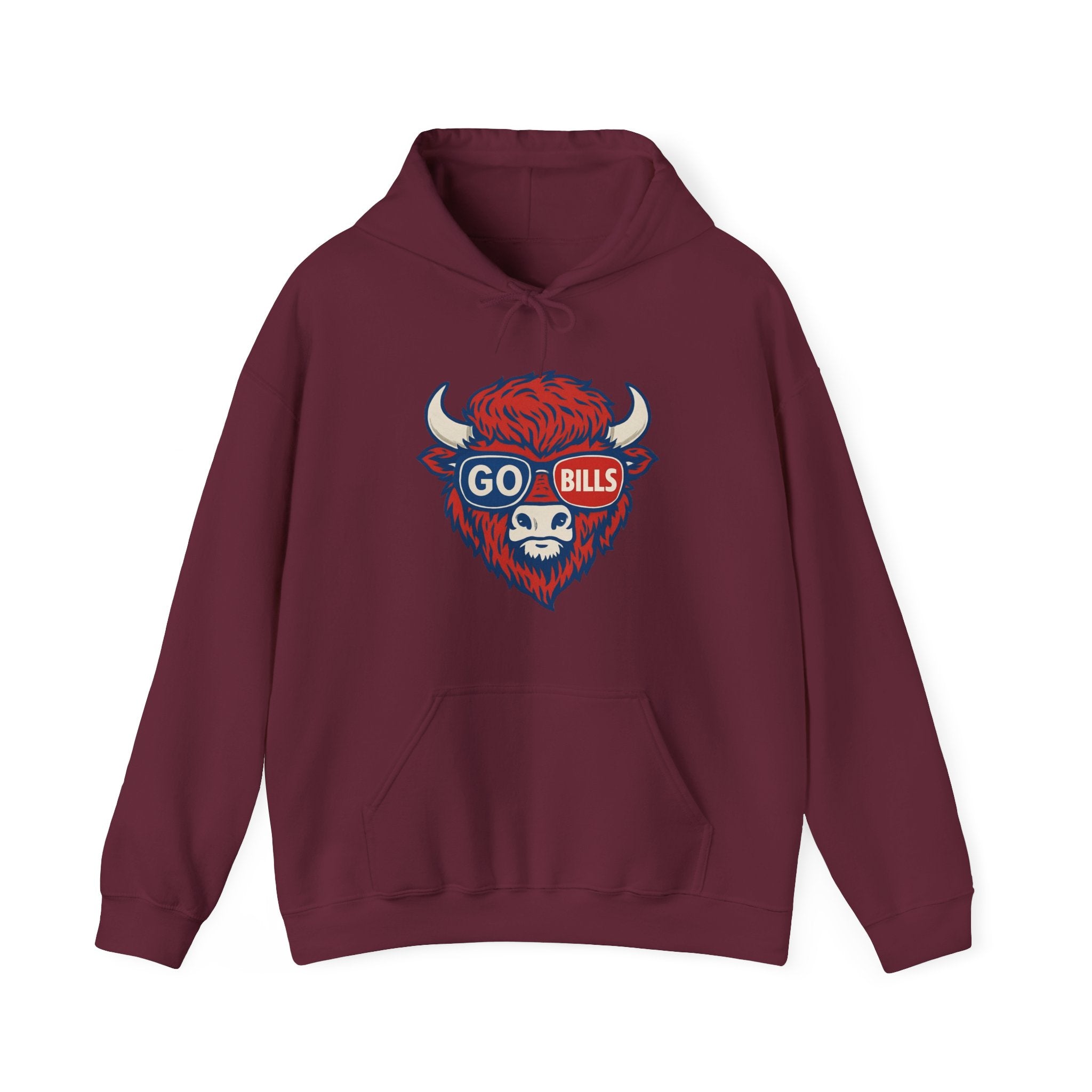 This cozy hoodie made by Gildan brings game-day spirit and slow-winter comfort together. A bold, hand-illustrated buffalo head—rocking a shaggy red mane and a navy eye-mask that reads GO / BILLS—sits centered on a clean background.