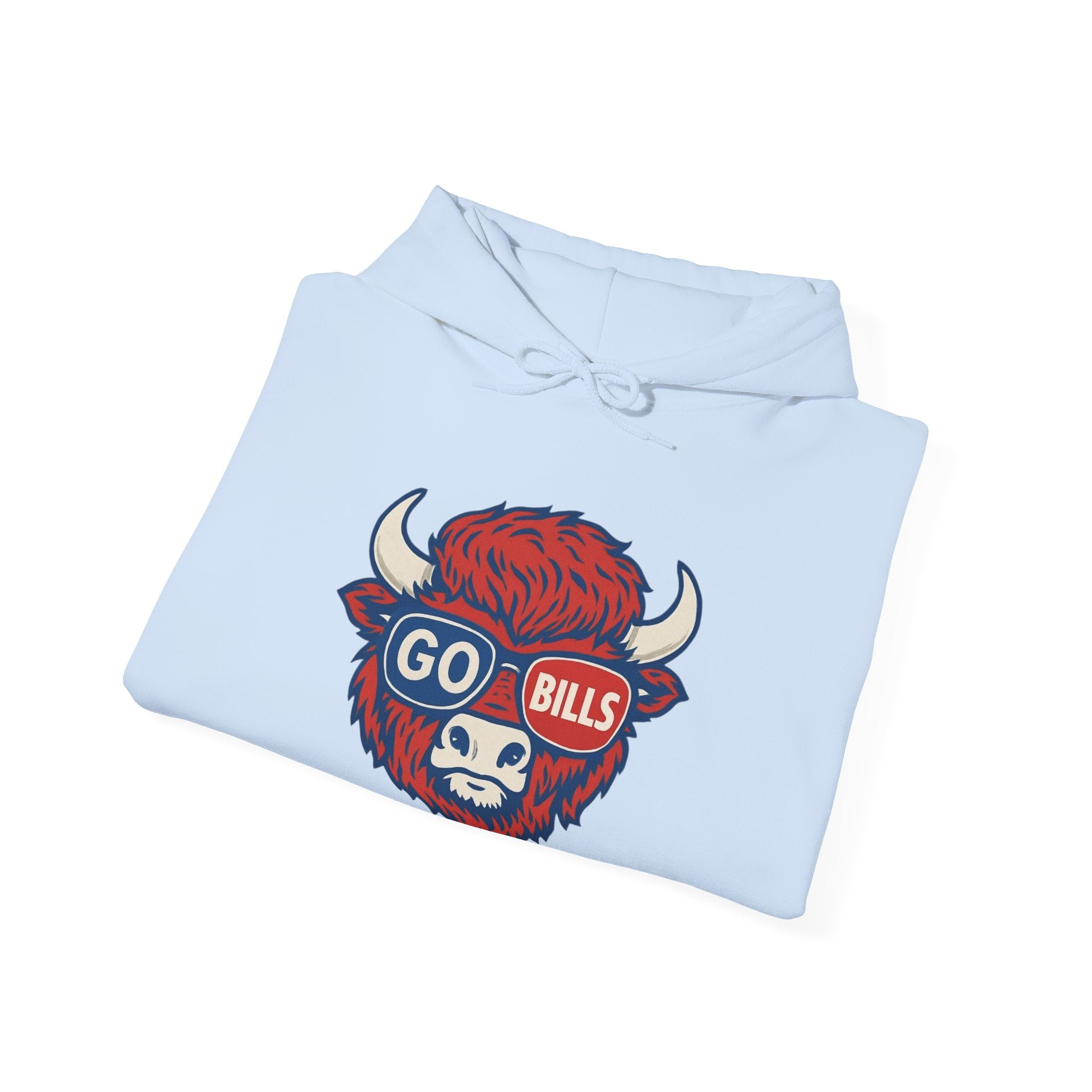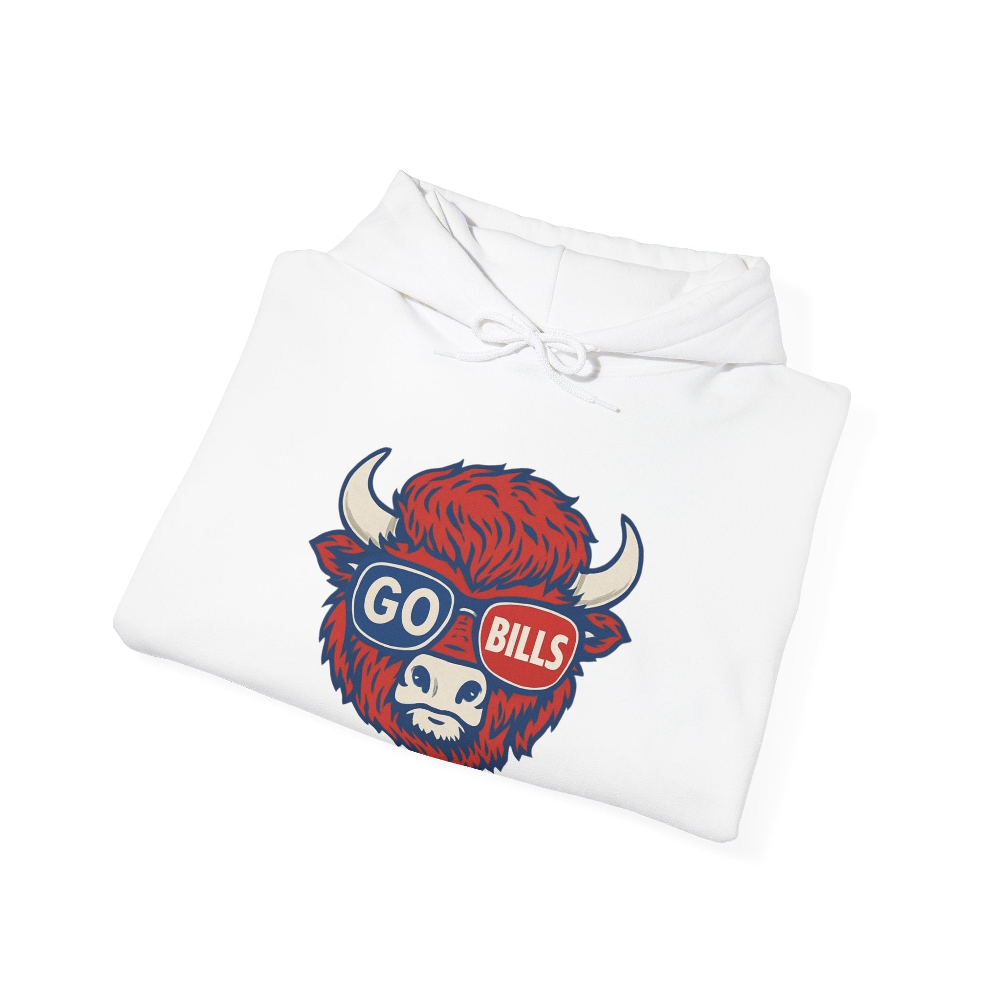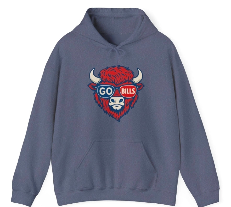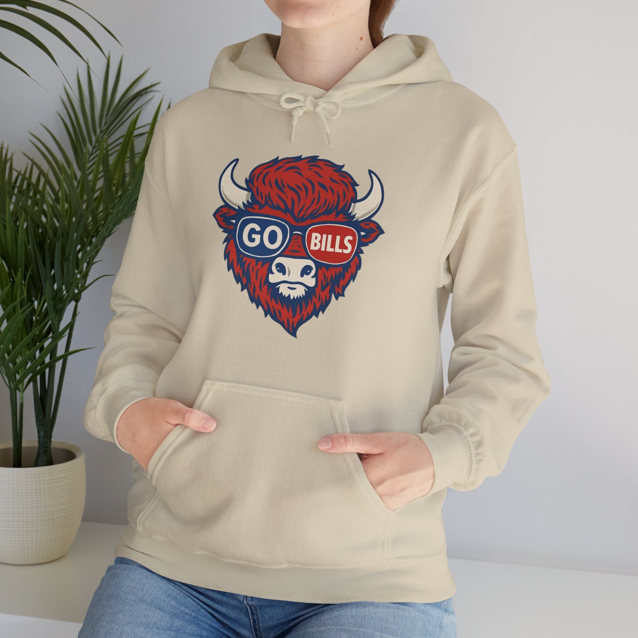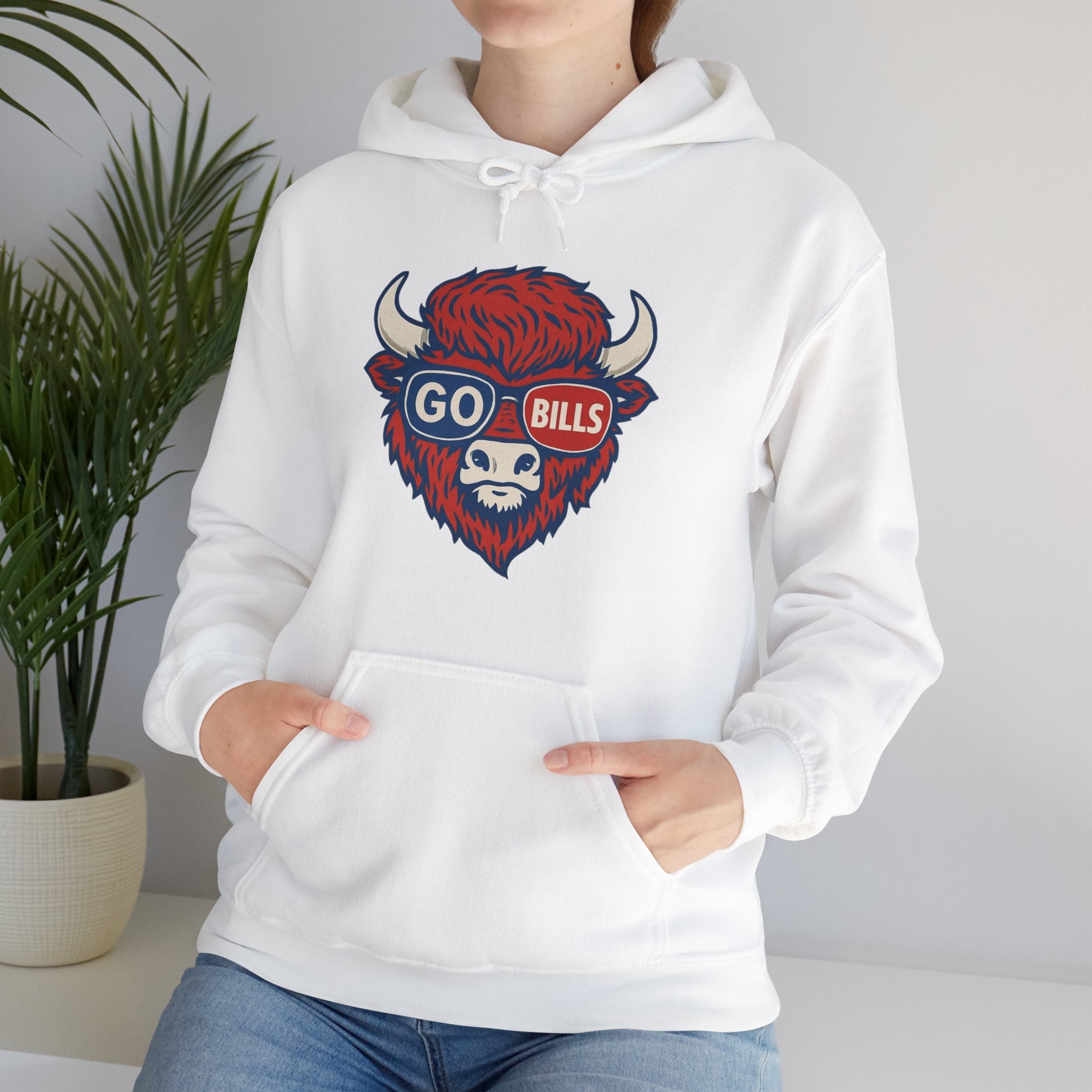 This cozy hoodie made by Gildan brings game-day spirit and slow-winter comfort together. A bold, hand-illustrated buffalo head—rocking a shaggy red mane and a navy eye-mask that reads GO / BILLS—sits centered on a clean background.