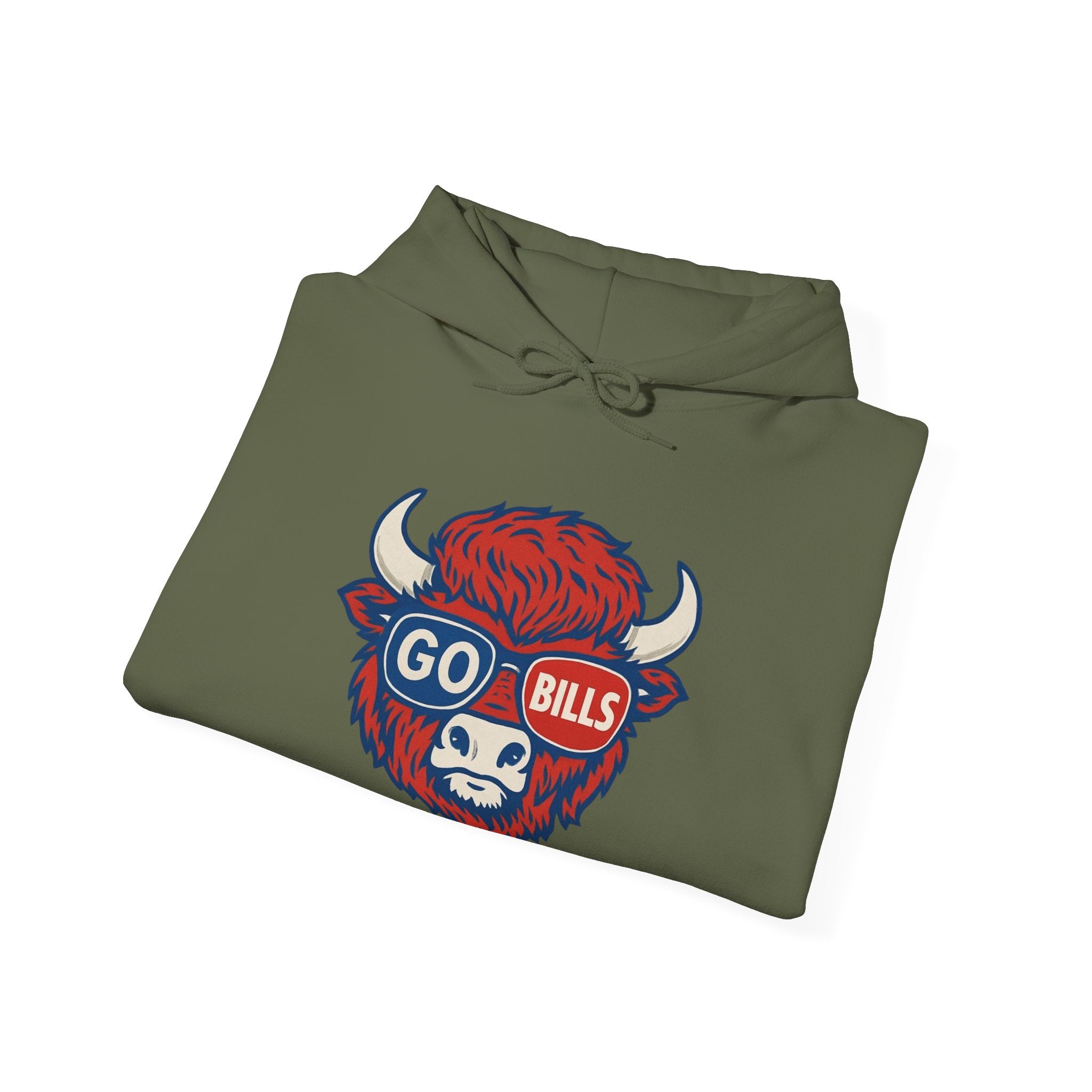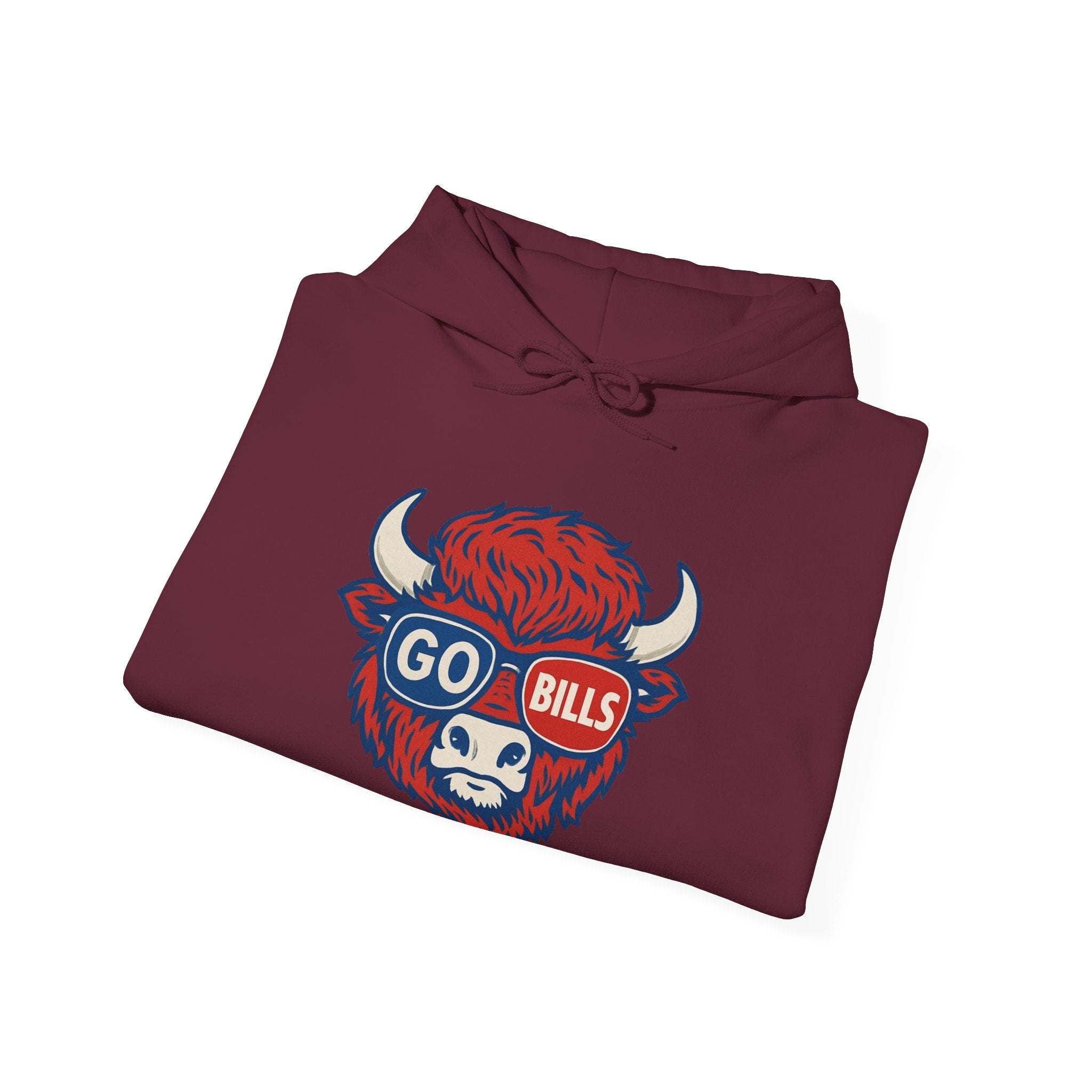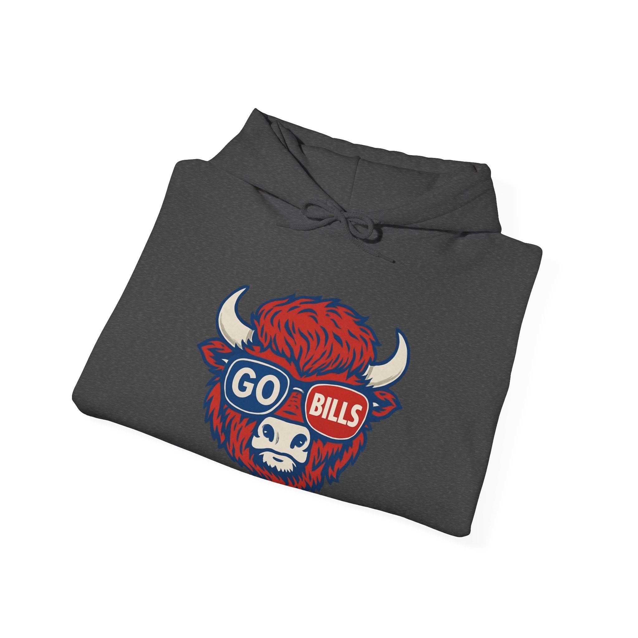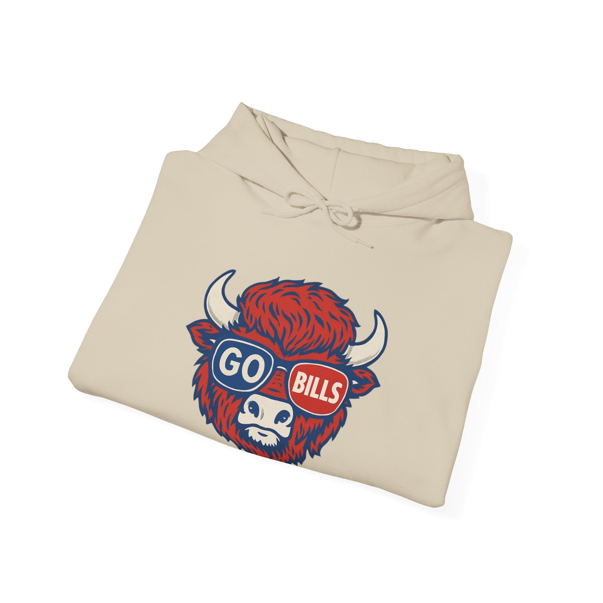 This cozy hoodie made by Gildan brings game-day spirit and slow-winter comfort together. A bold, hand-illustrated buffalo head—rocking a shaggy red mane and a navy eye-mask that reads GO / BILLS—sits centered on a clean background.