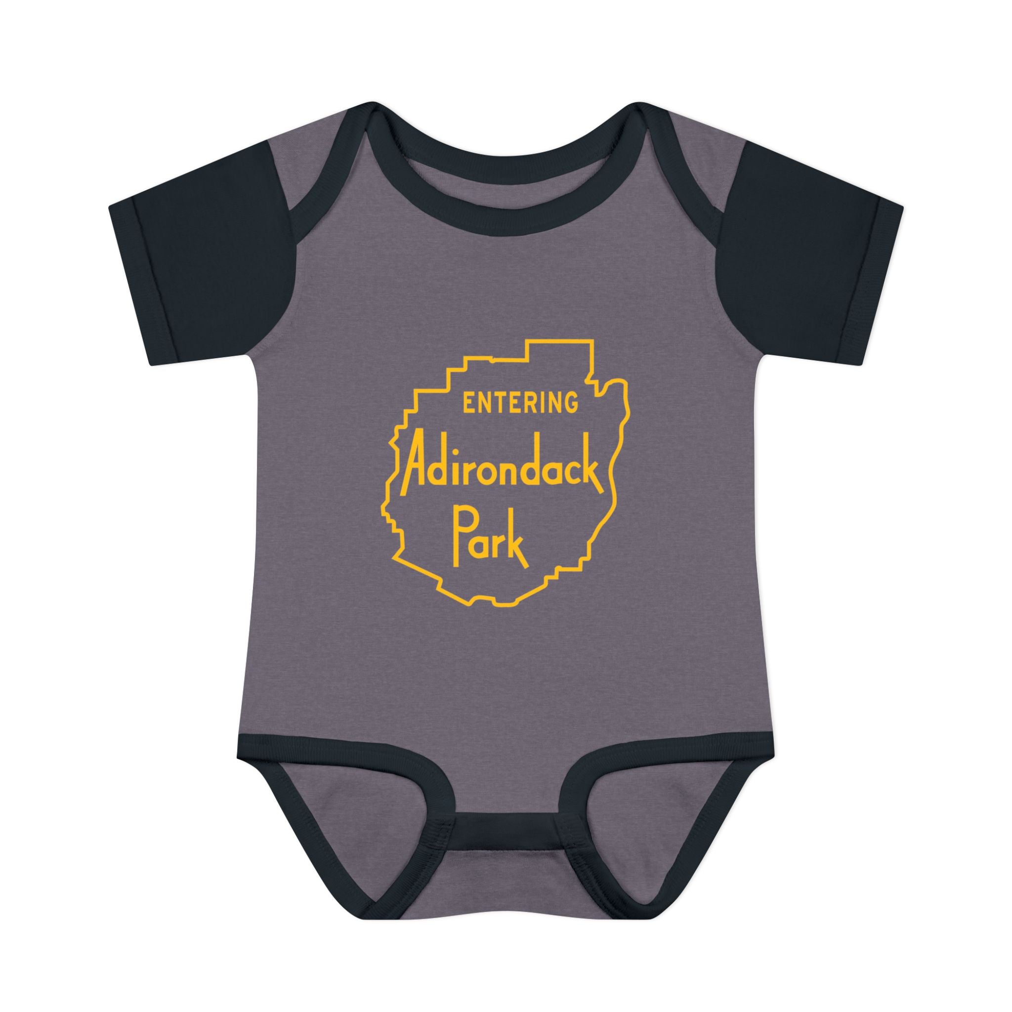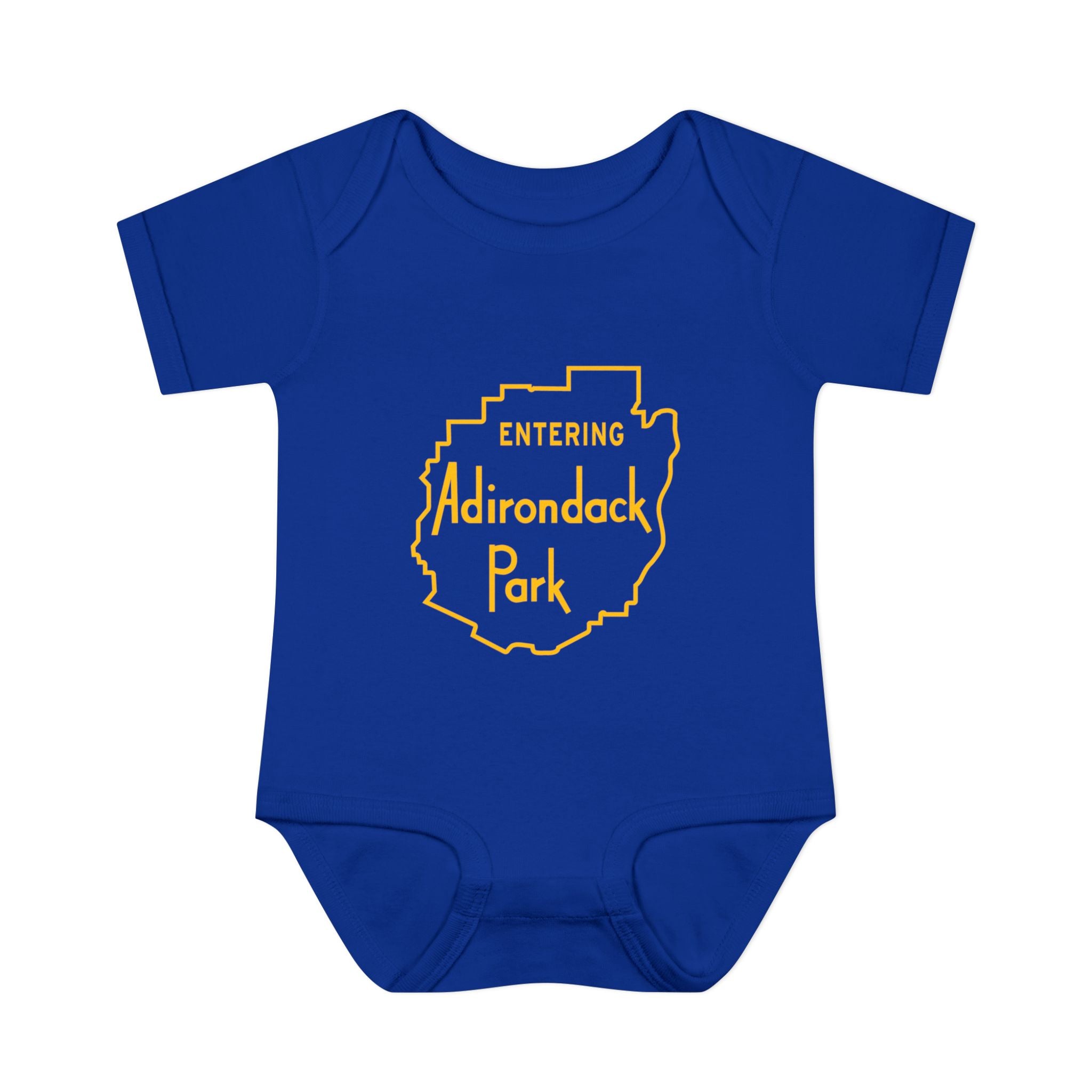 This soft, simple infant bodysuit carries the Park outline print that reads “Entering Adirondack Park,” like a tiny passport stamp for outdoor families.