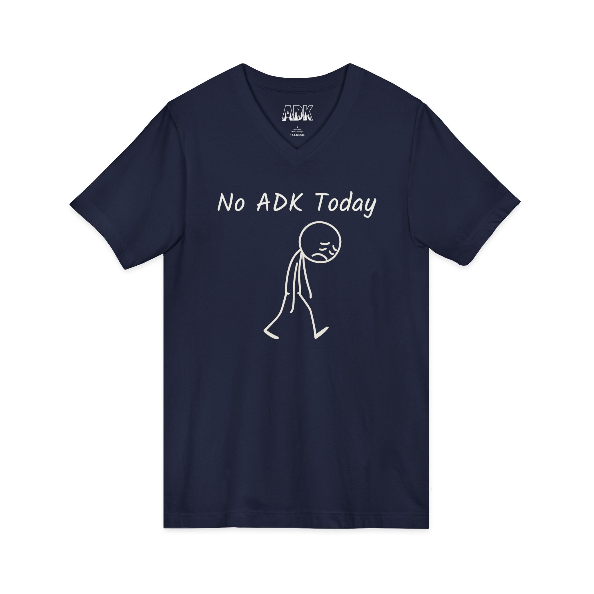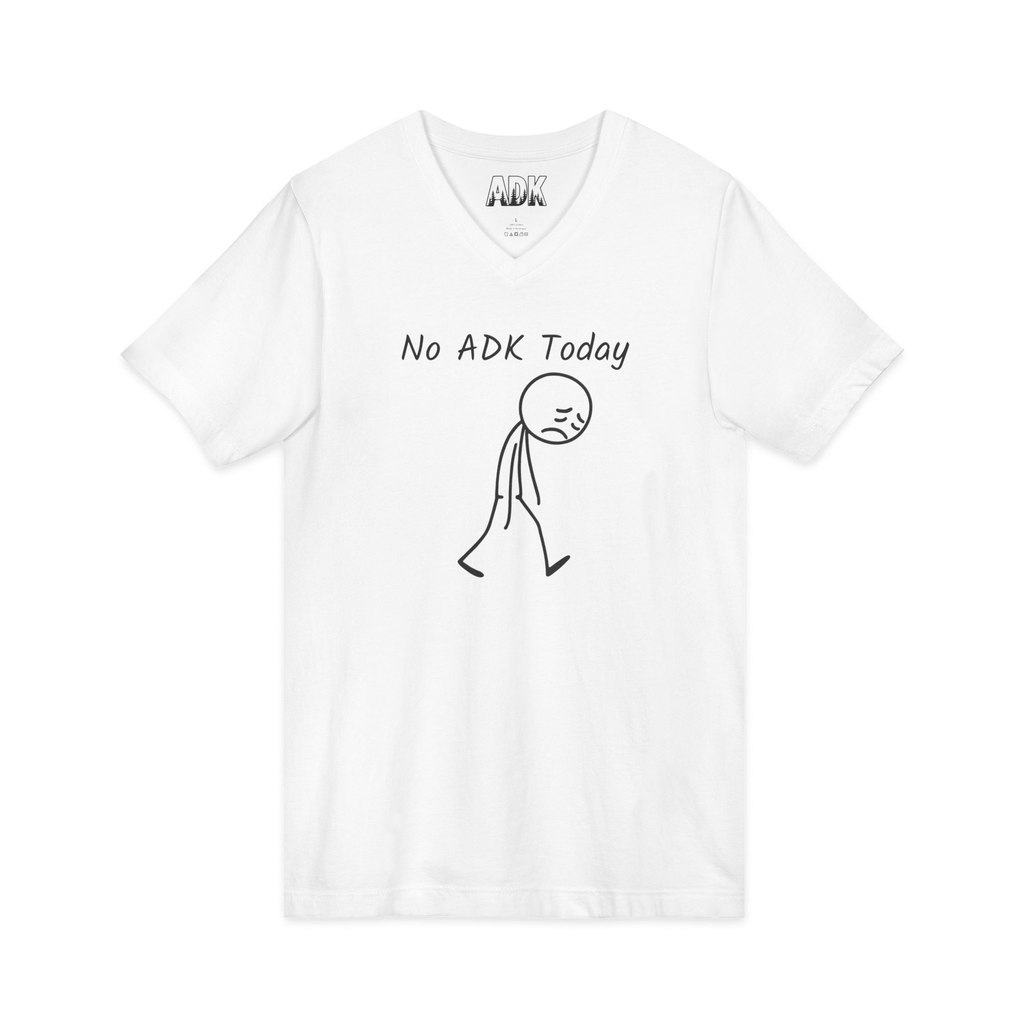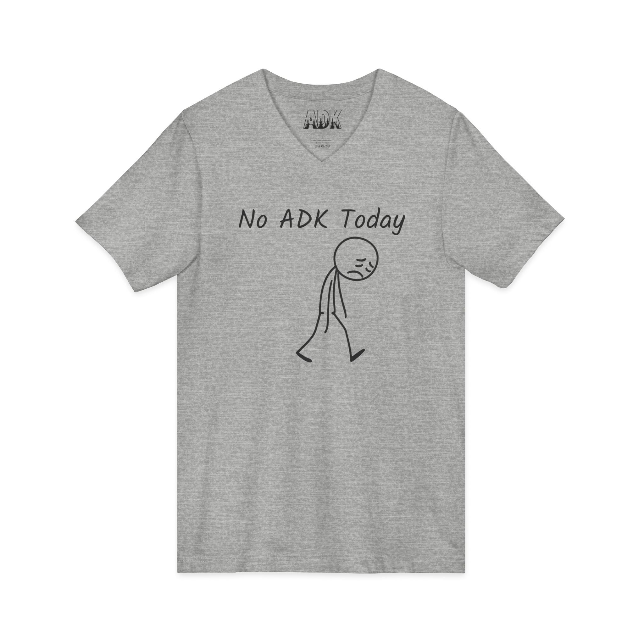 This Bella+Canvas lightweight V-neck consists of a hand-drawn stick-figure slumps beneath the words “No ADK Today,” a small, relatable shrug for those of us who miss the Adirondacks. ADK with pine trees in the inner neck area.