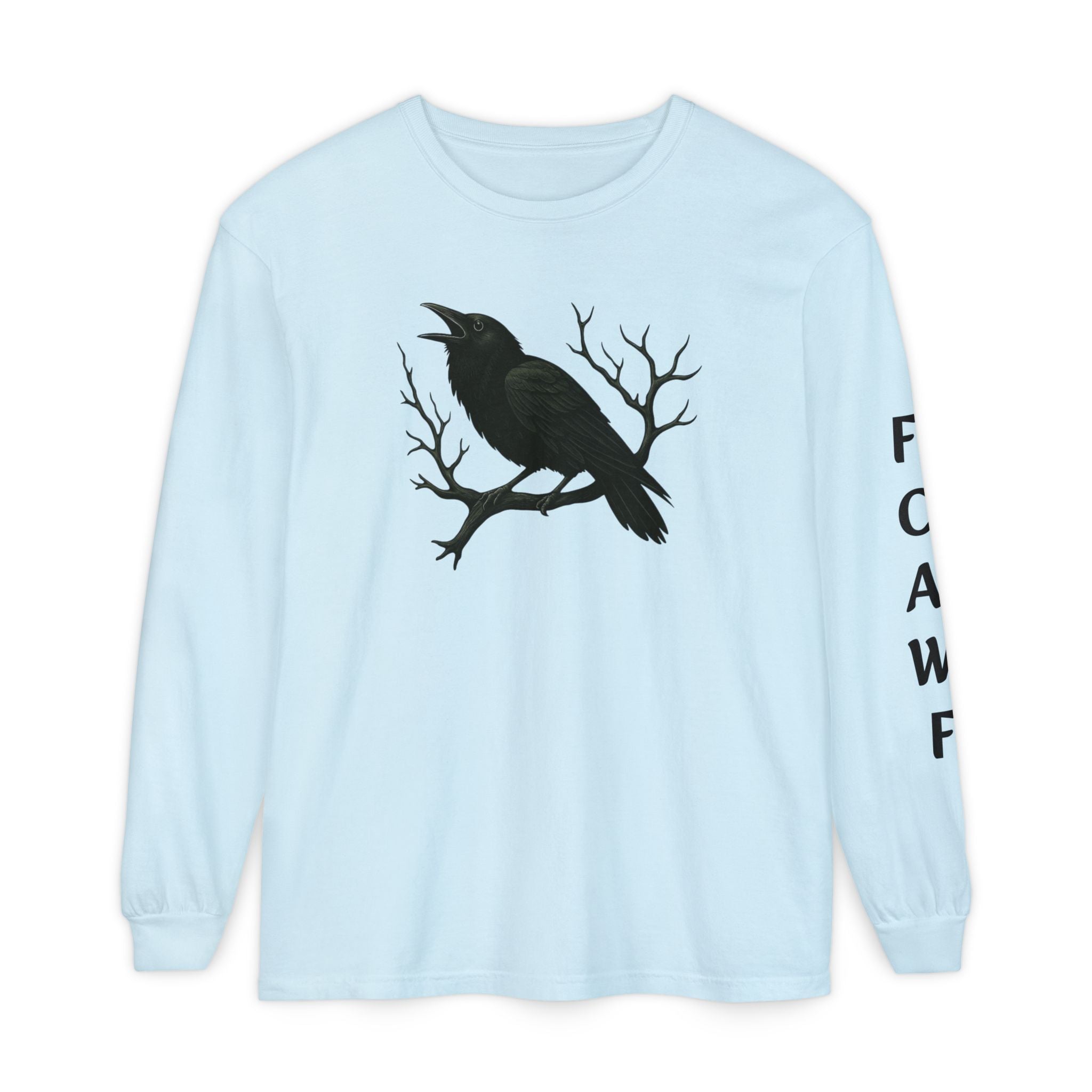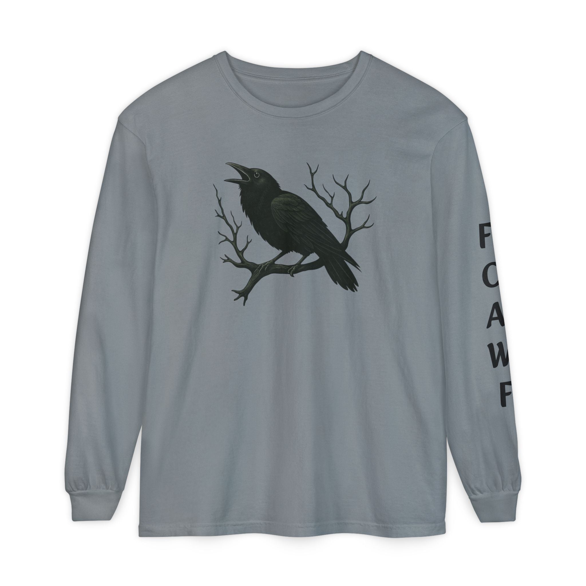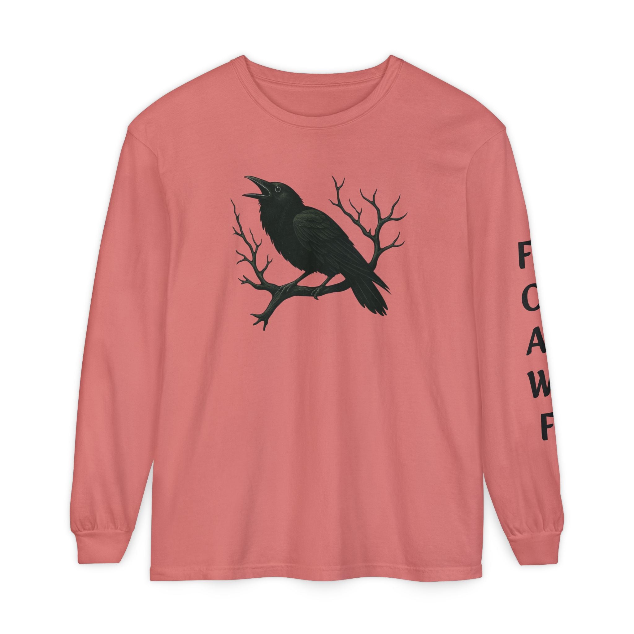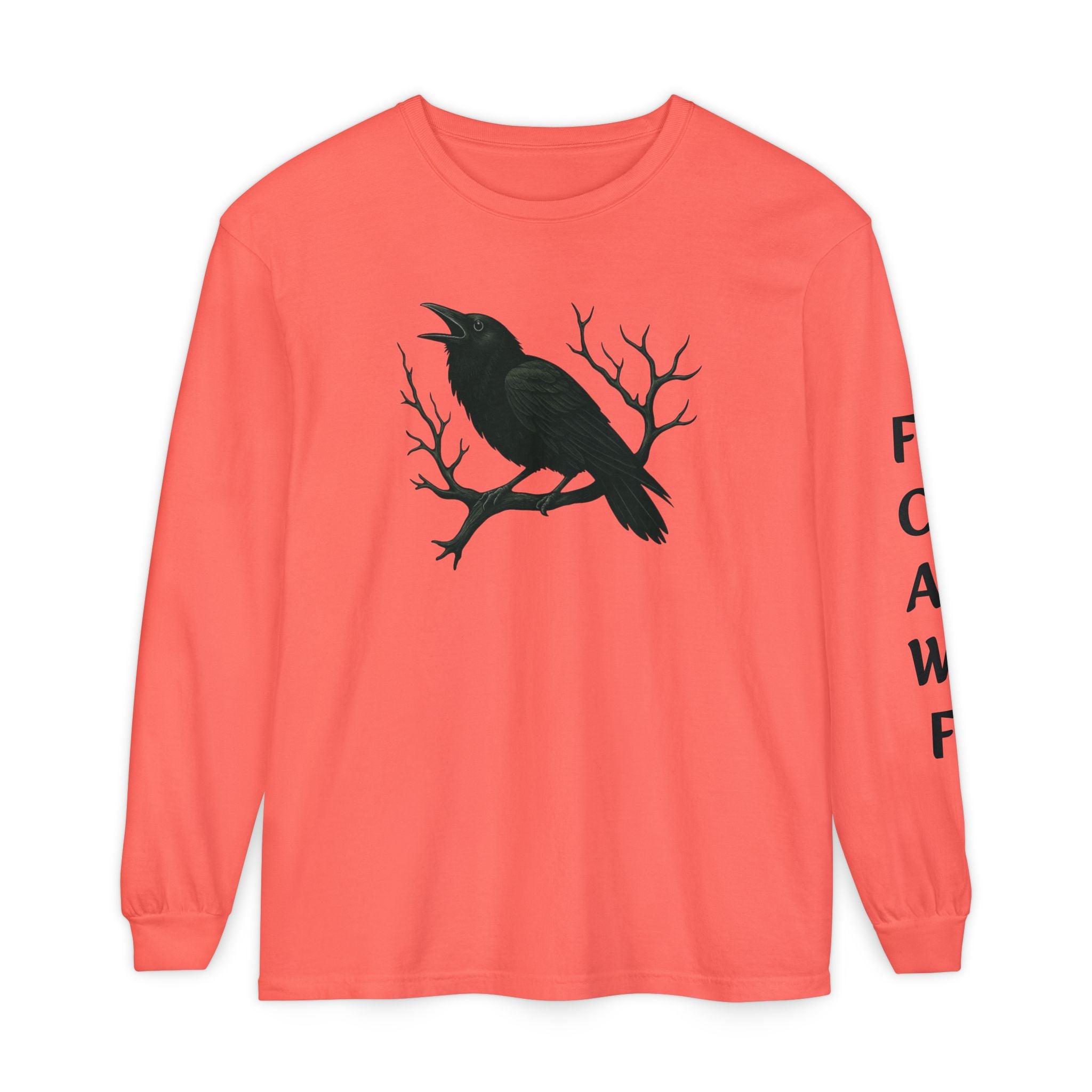 This Comfort Colors long sleeve is soft, roomy and lightweight. It feels both substantial and lived-in from the first wear — the ring-spun cotton is smooth against the skin and the ribbed cuffs hold shape through repeated wear.