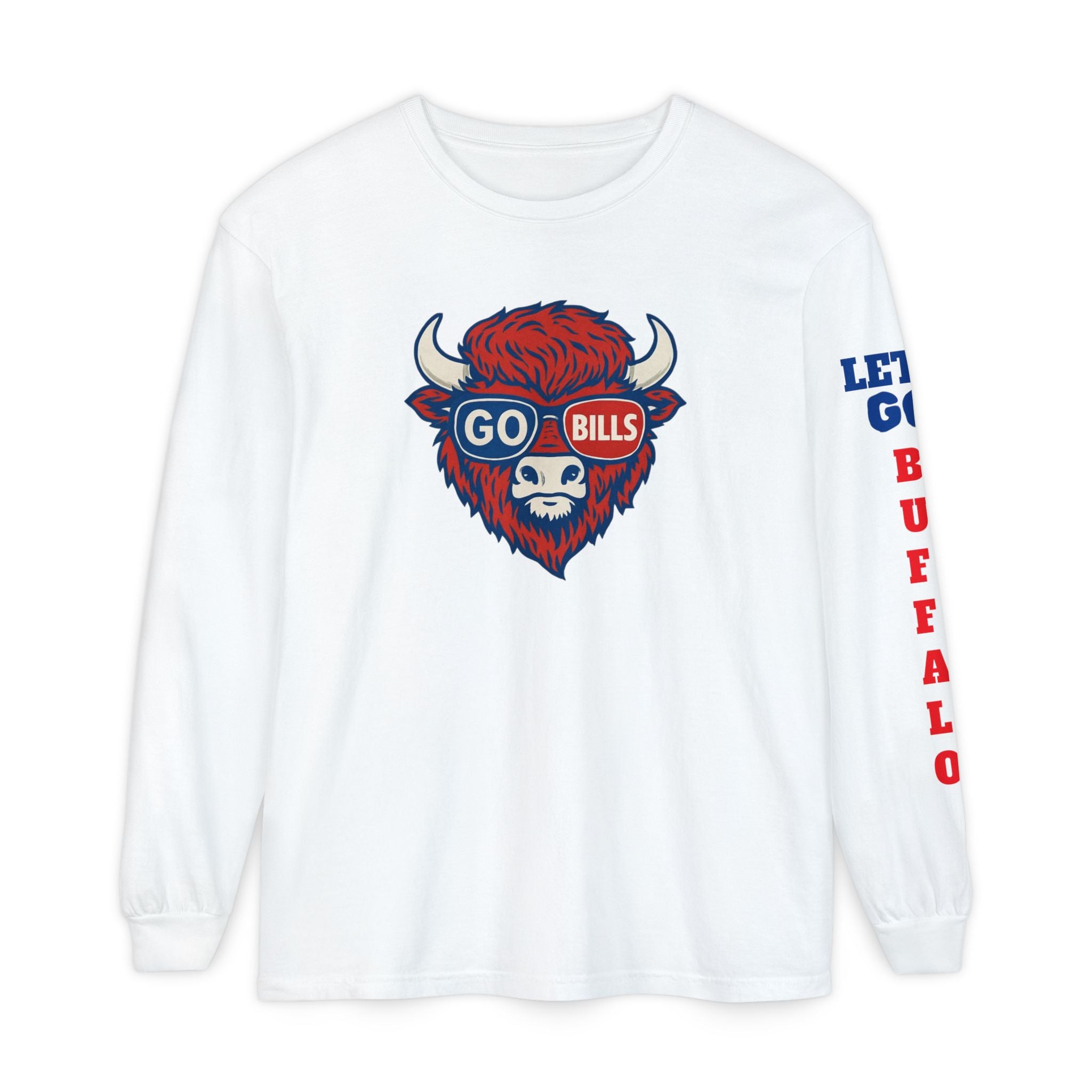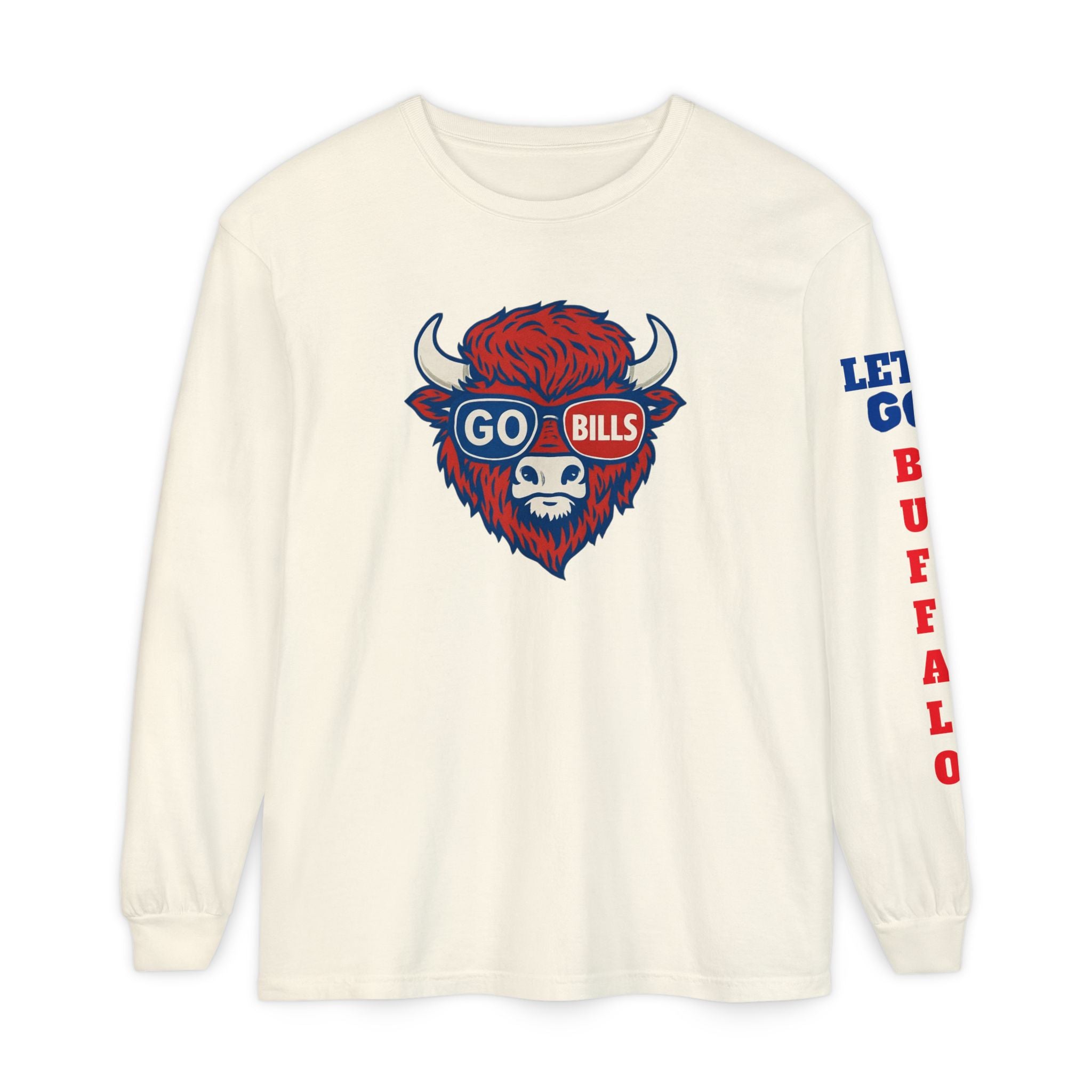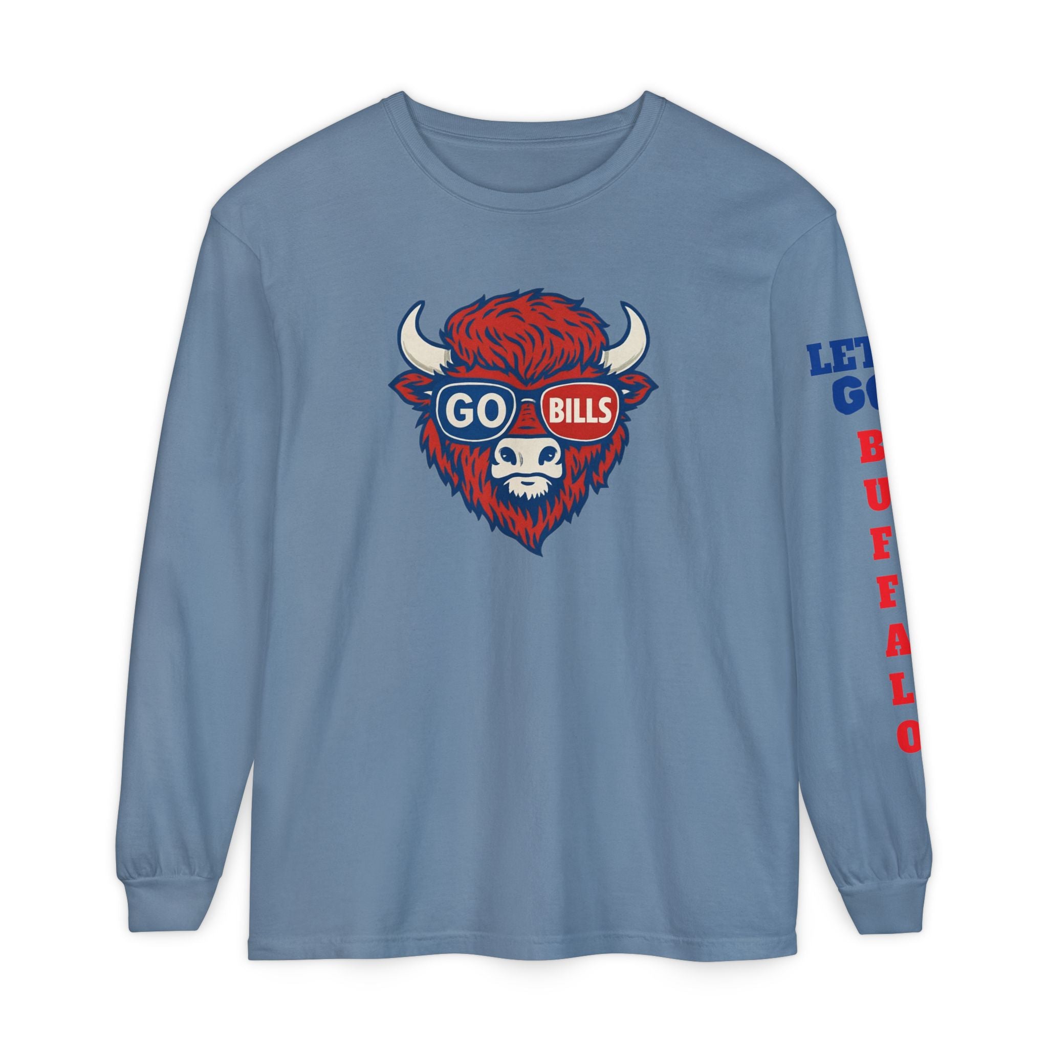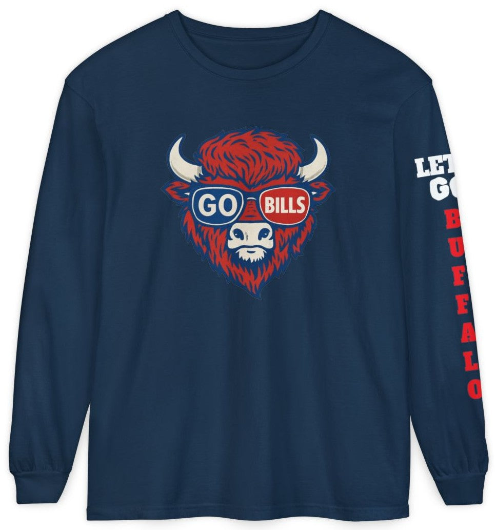 This Comfort Colors garment-dyed long sleeve brings game-day energy in a soft, lived-in tee. A bold Buffalo-inspired bison graphic sits on the chest, sunglasses reading “Go Bills,” while the sleeve shows spirited LET'S GO BUFFALO in red-and-blue lettering down the arm.