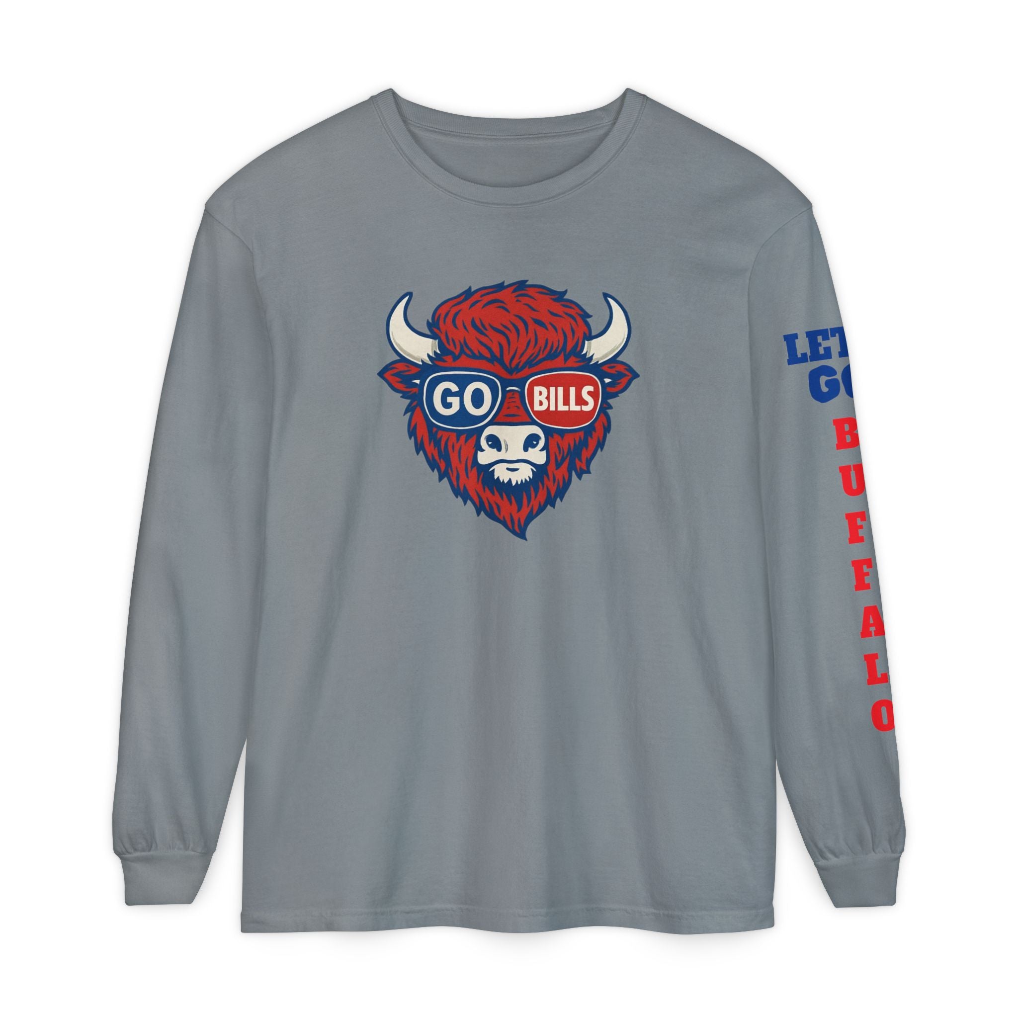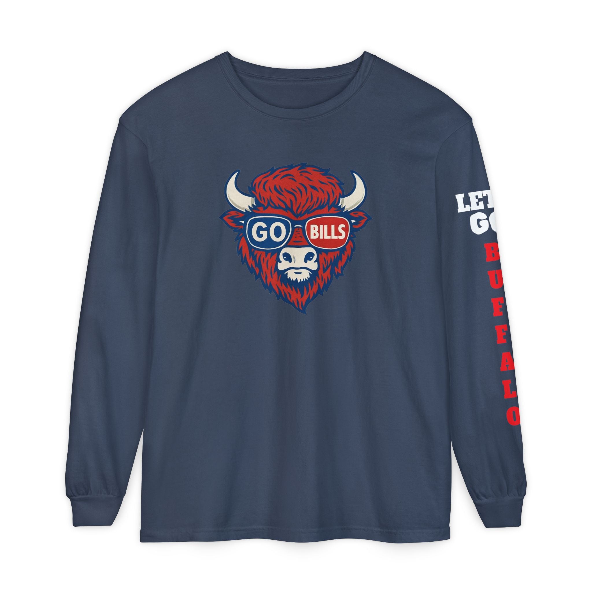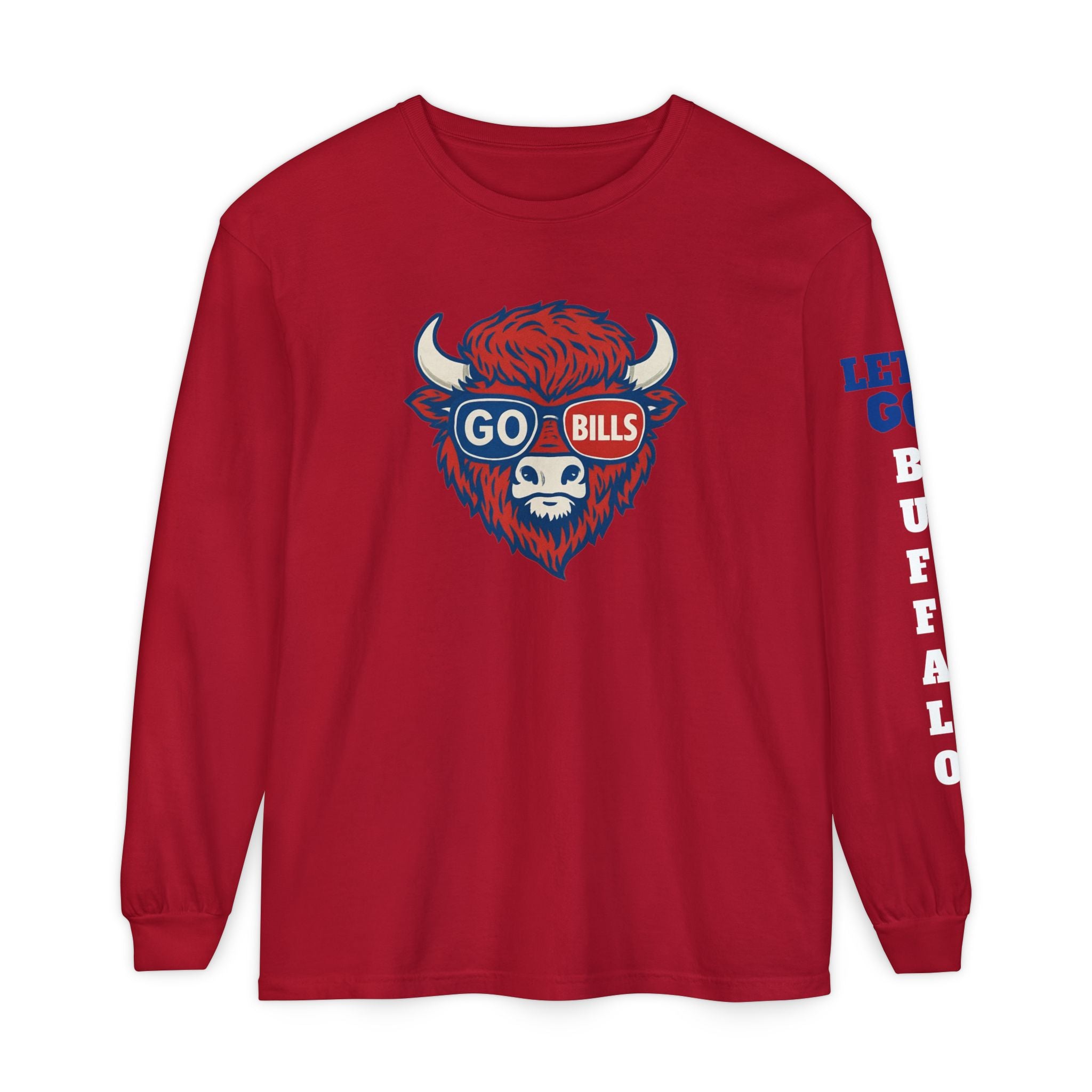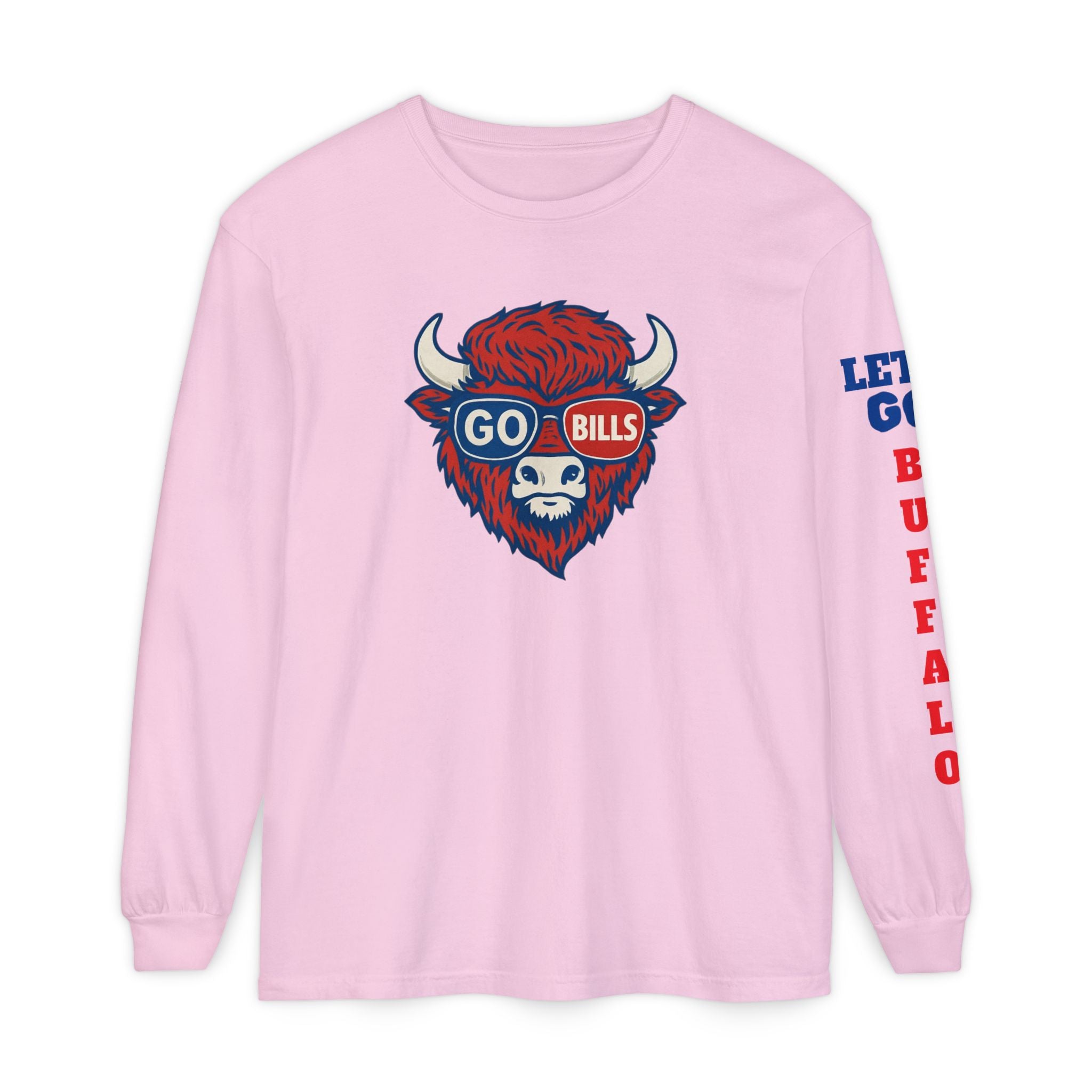 This Comfort Colors garment-dyed long sleeve brings game-day energy in a soft, lived-in tee. A bold Buffalo-inspired bison graphic sits on the chest, sunglasses reading “Go Bills,” while the sleeve shows spirited LET'S GO BUFFALO in red-and-blue lettering down the arm.