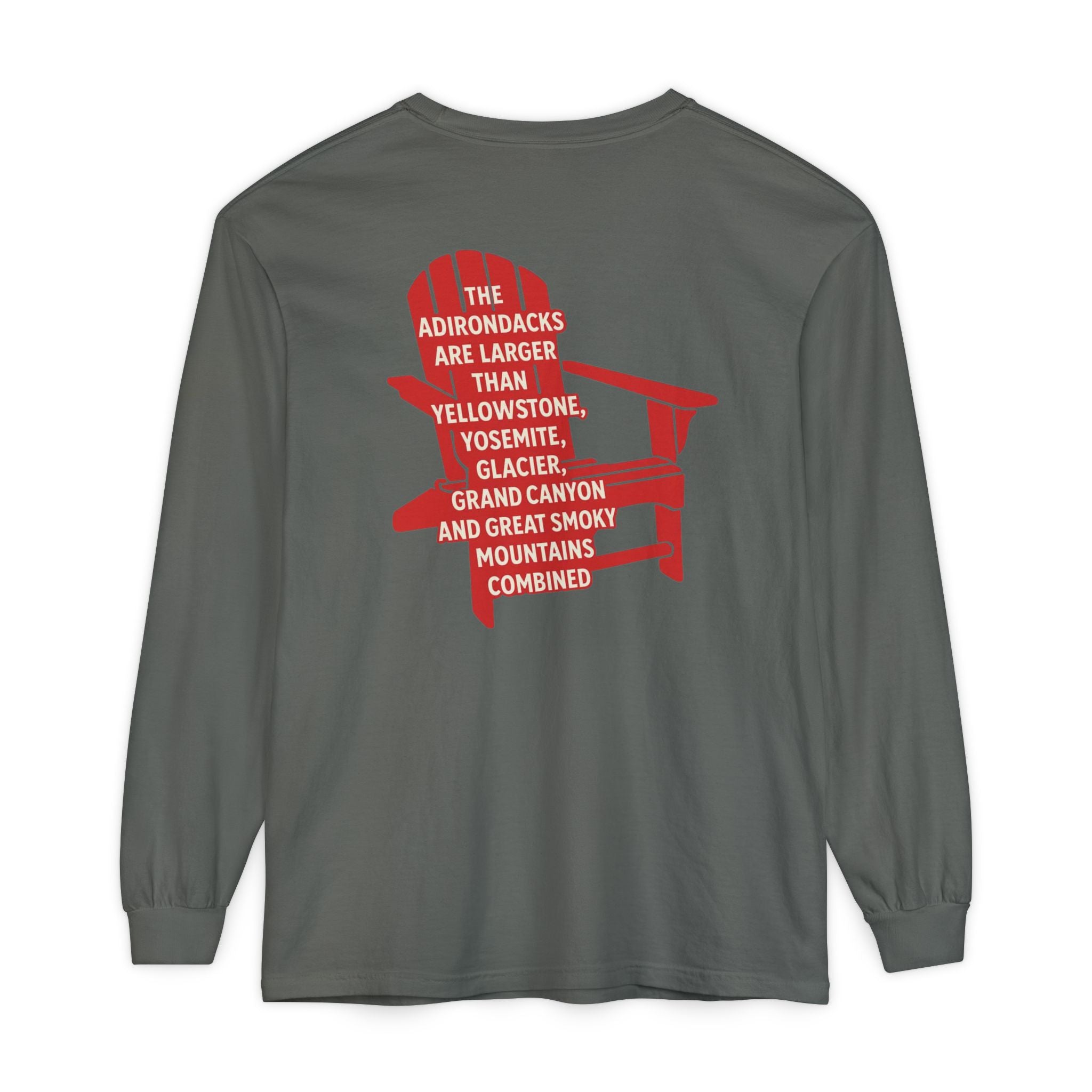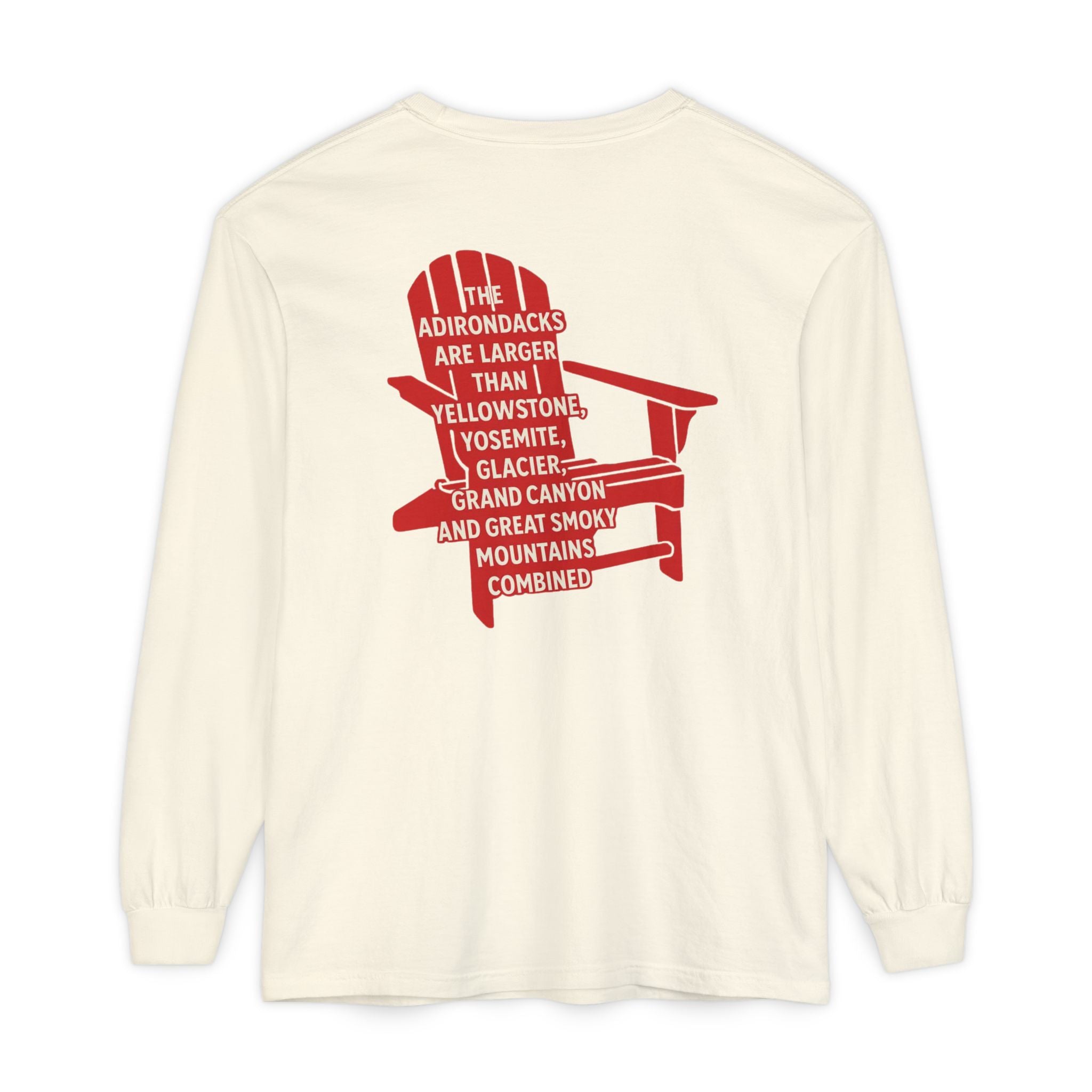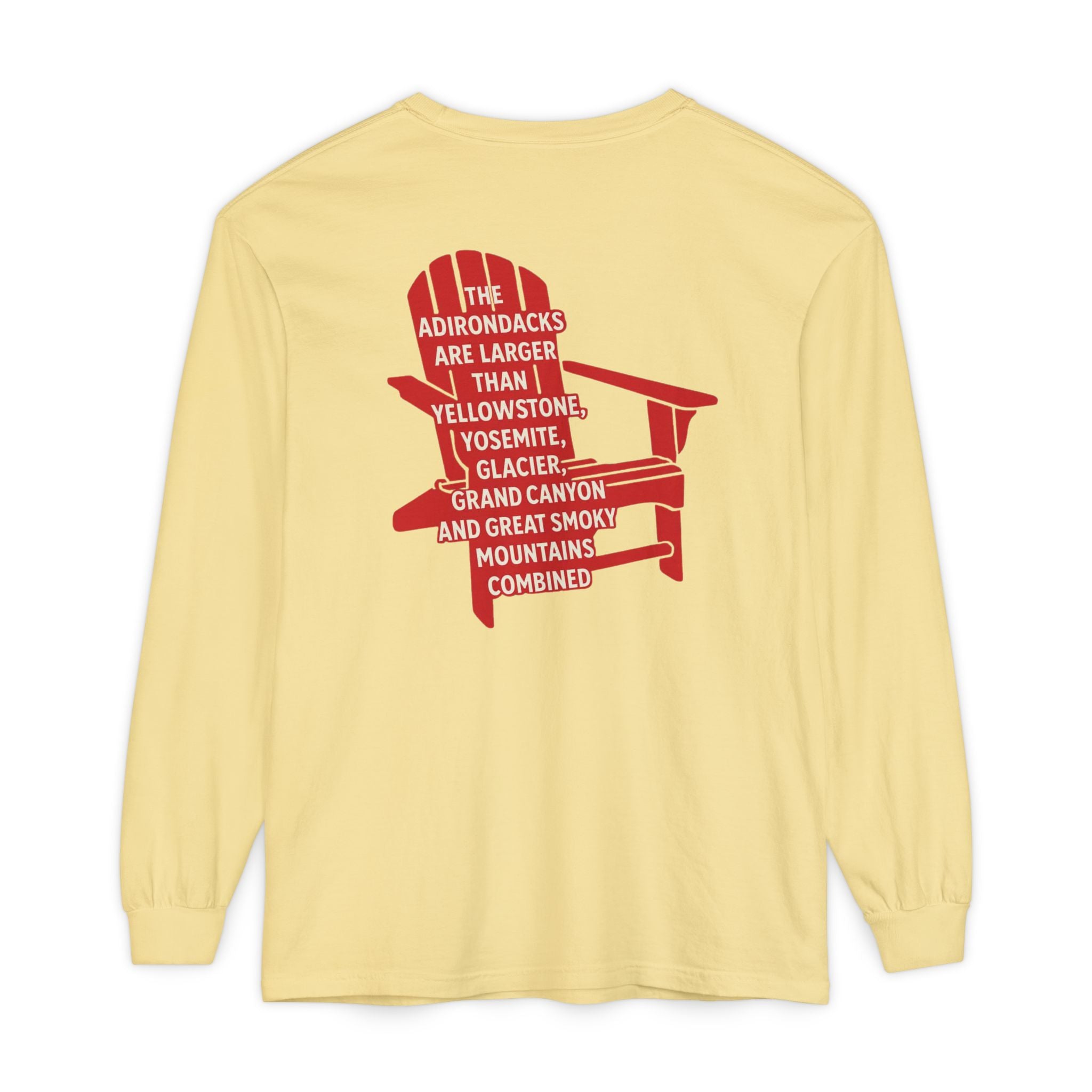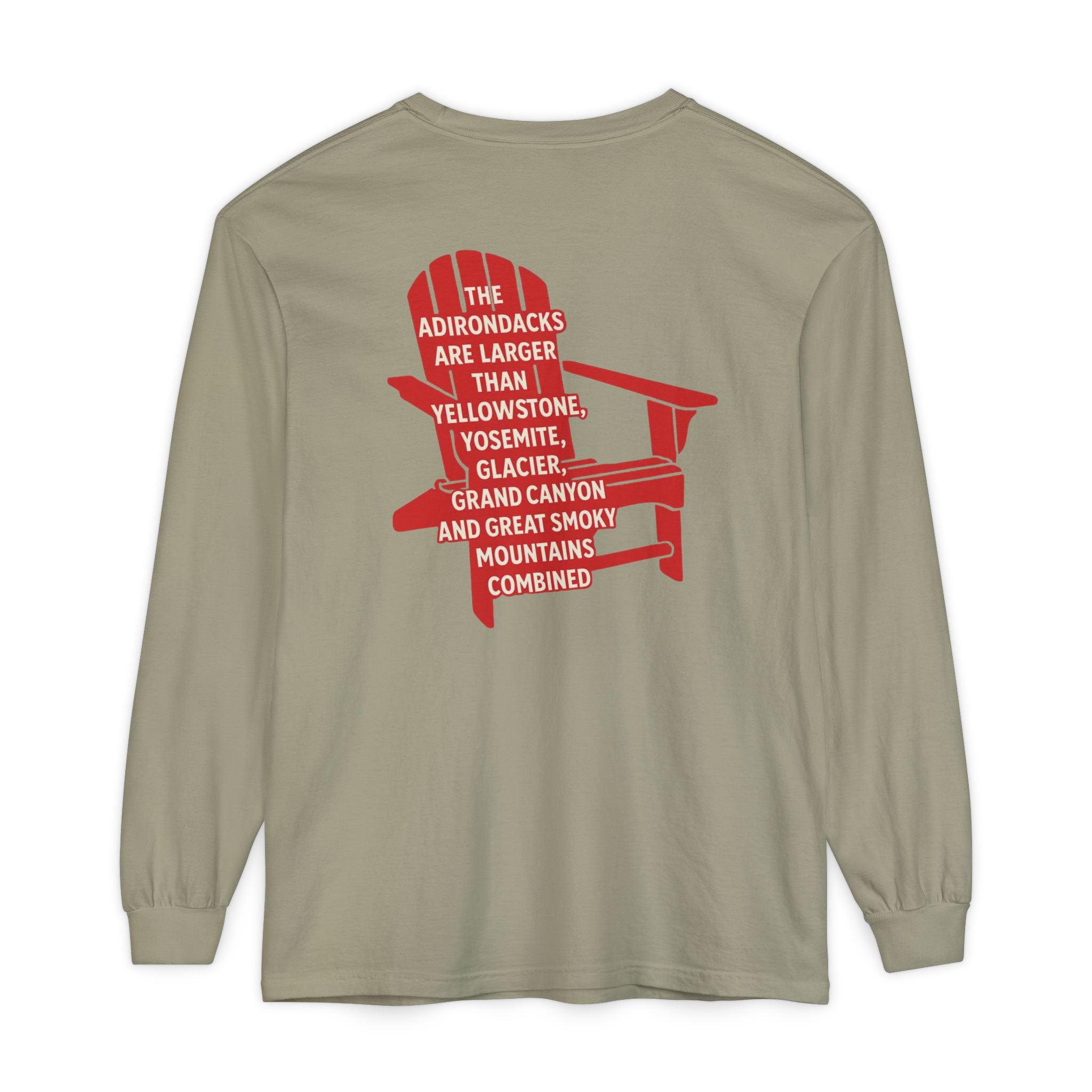 This comfort colors,garment-dyed long sleeve brings easygoing cabin energy to everyday wear. The front’s playful script—“Not To Flex BUT . . .”—starts conversations, while the back’s Adirondack chair silhouette lists the other parks that it is bigger than. The soft, lived-in color from garment-dyeing and the medium-weight ring-spun cotton feel comfortable layered under a flannel or solo on a cool morning. It sits with a classic, relaxed fit that moves with you on hikes, around a camp stove, or during slow weekends at the lake.