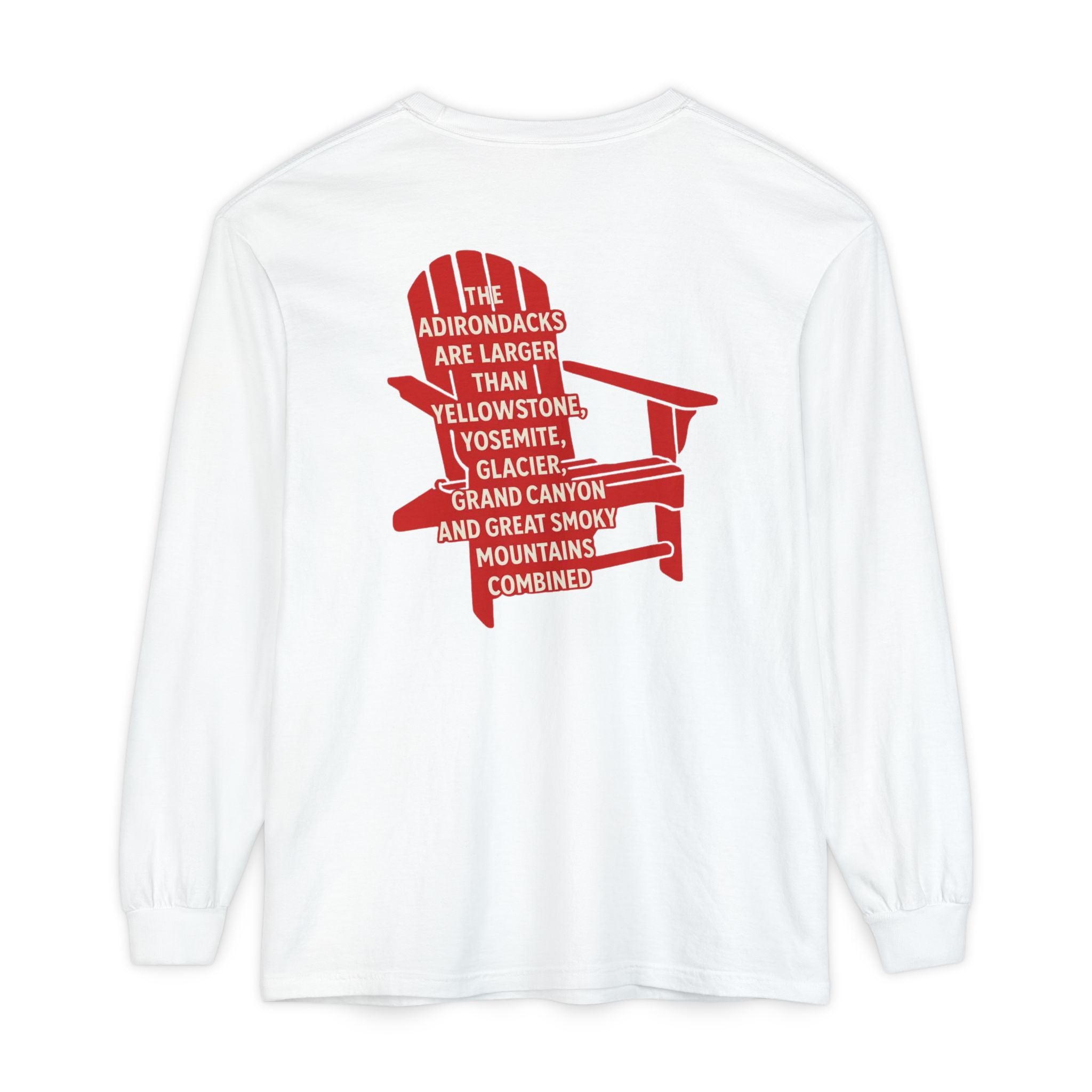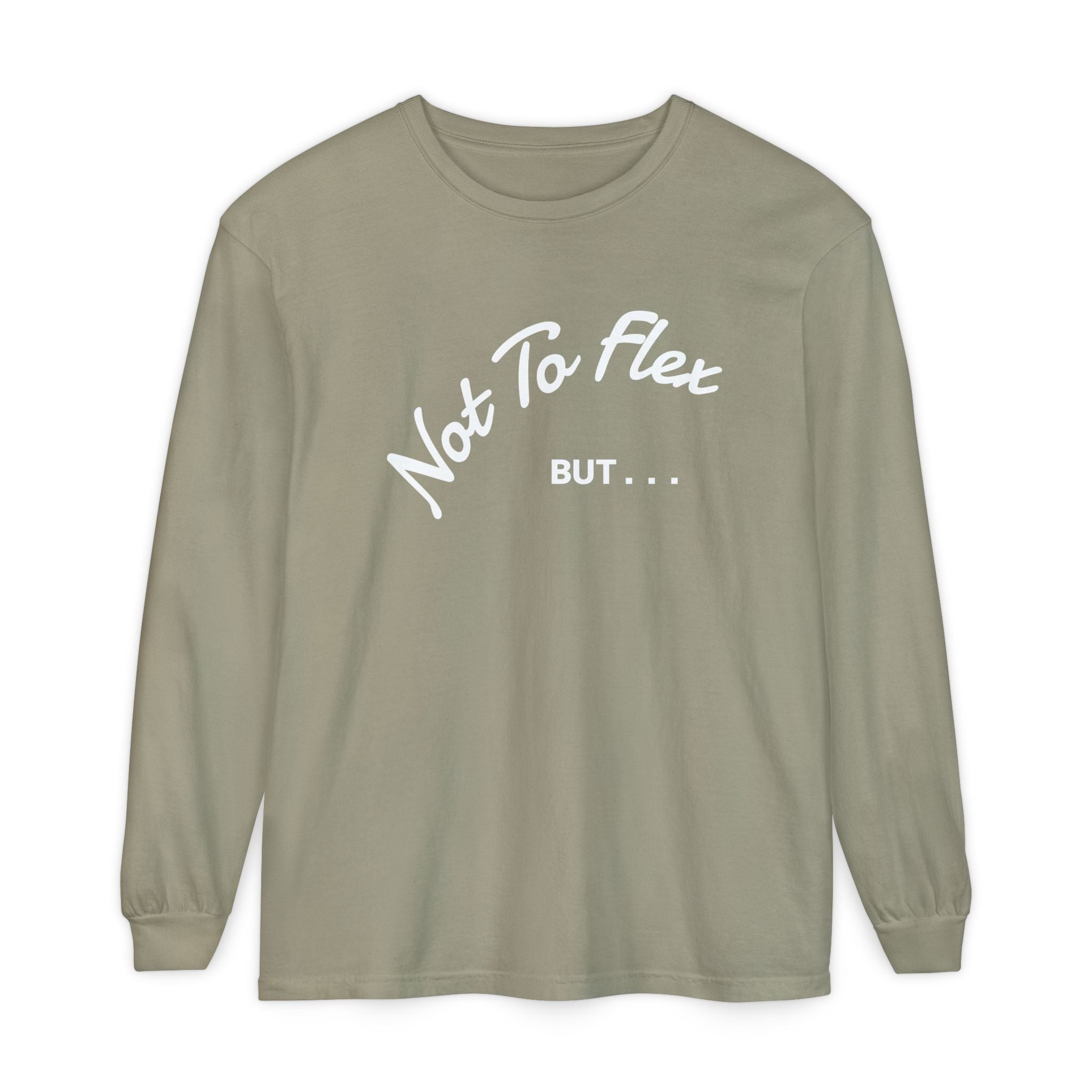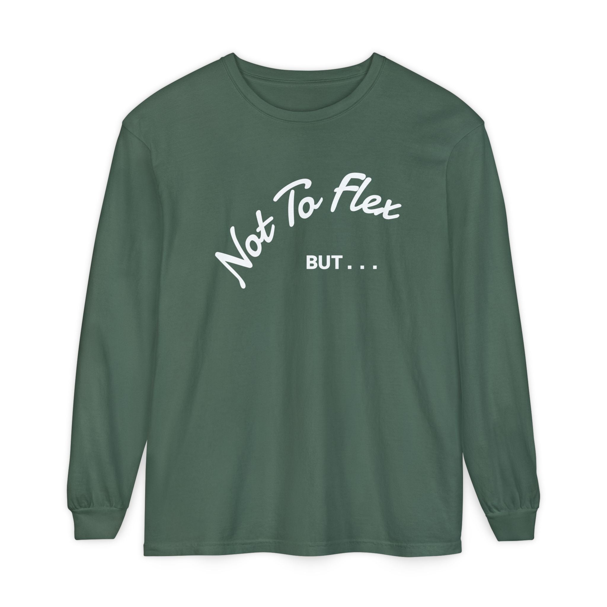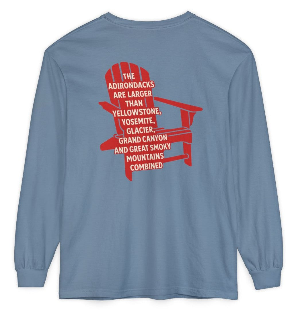 This comfort colors,garment-dyed long sleeve brings easygoing cabin energy to everyday wear. The front’s playful script—“Not To Flex BUT . . .”—starts conversations, while the back’s Adirondack chair silhouette lists the other parks that it is bigger than. The soft, lived-in color from garment-dyeing and the medium-weight ring-spun cotton feel comfortable layered under a flannel or solo on a cool morning. It sits with a classic, relaxed fit that moves with you on hikes, around a camp stove, or during slow weekends at the lake.