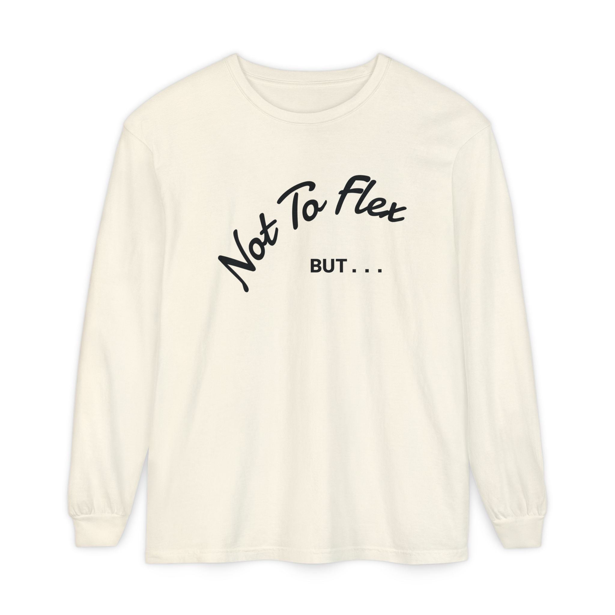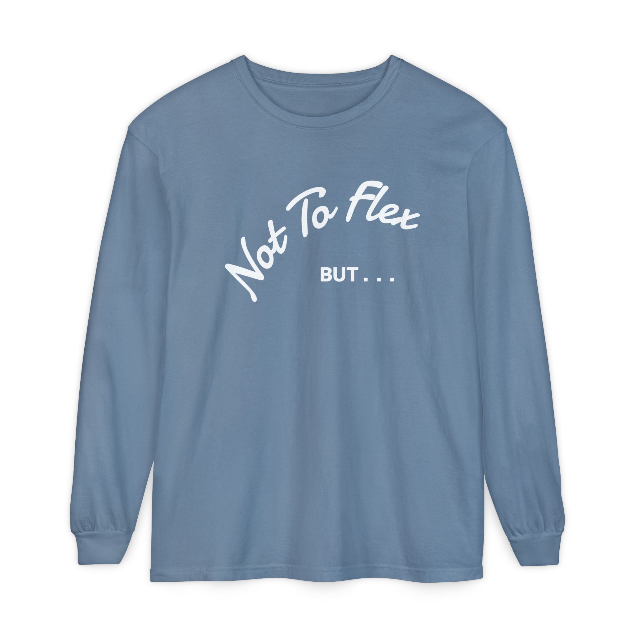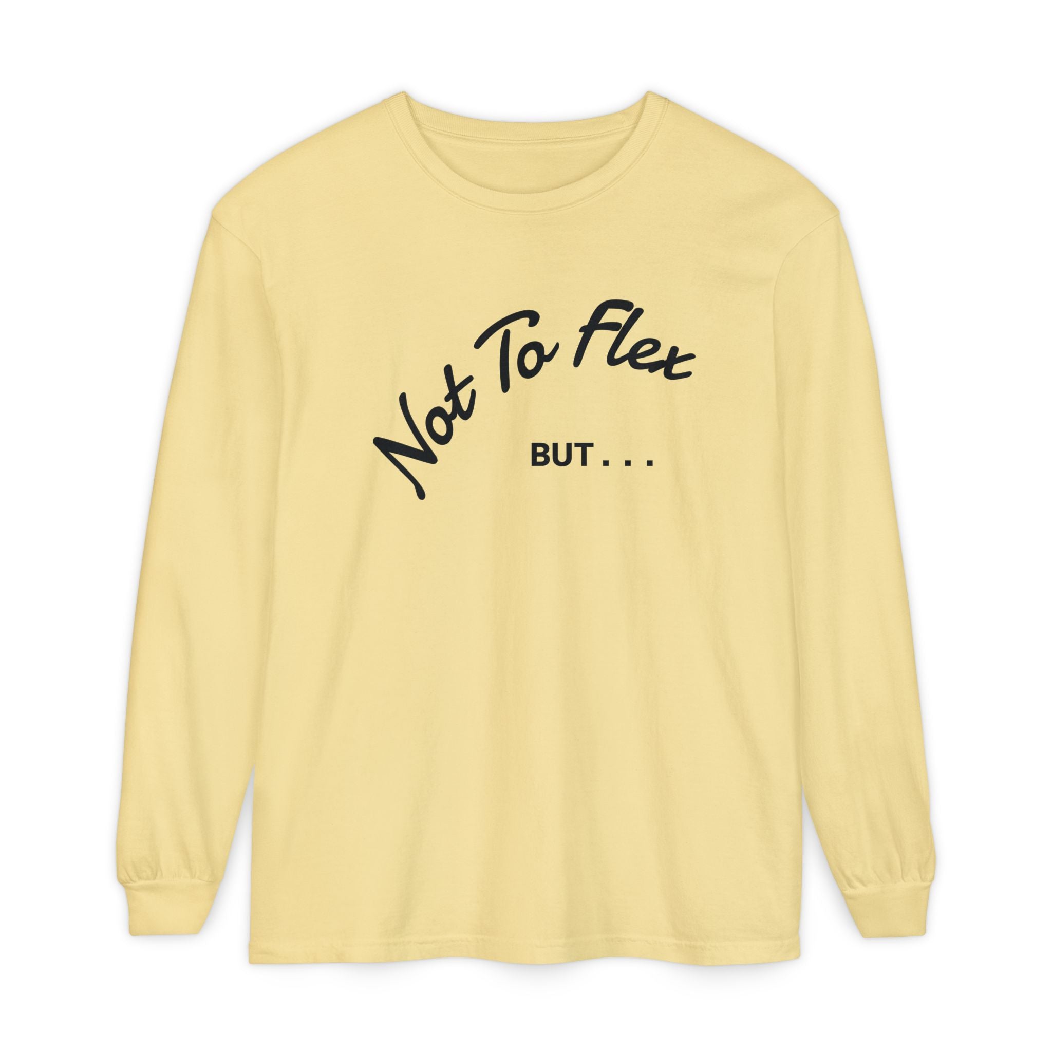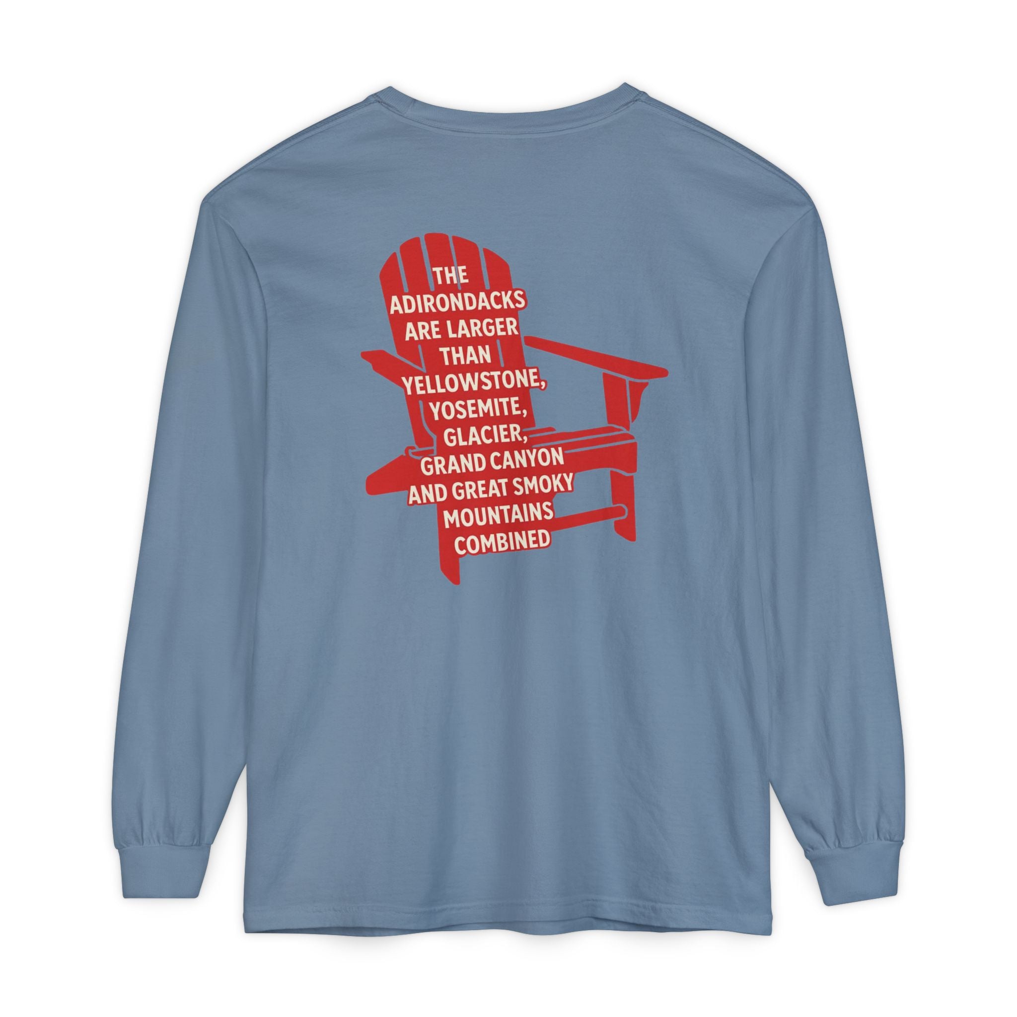 This comfort colors,garment-dyed long sleeve brings easygoing cabin energy to everyday wear. The front’s playful script—“Not To Flex BUT . . .”—starts conversations, while the back’s Adirondack chair silhouette lists the other parks that it is bigger than. The soft, lived-in color from garment-dyeing and the medium-weight ring-spun cotton feel comfortable layered under a flannel or solo on a cool morning. It sits with a classic, relaxed fit that moves with you on hikes, around a camp stove, or during slow weekends at the lake.
