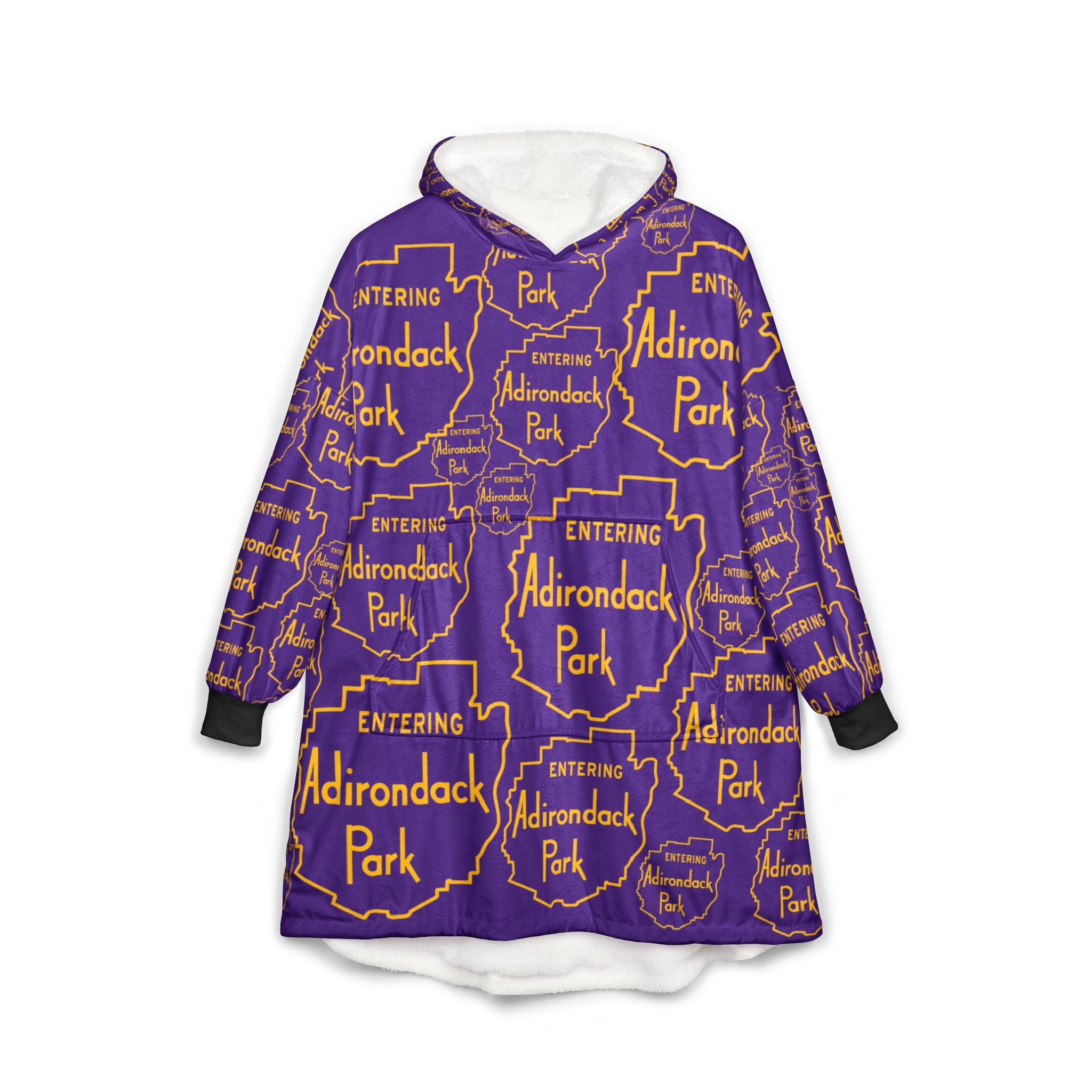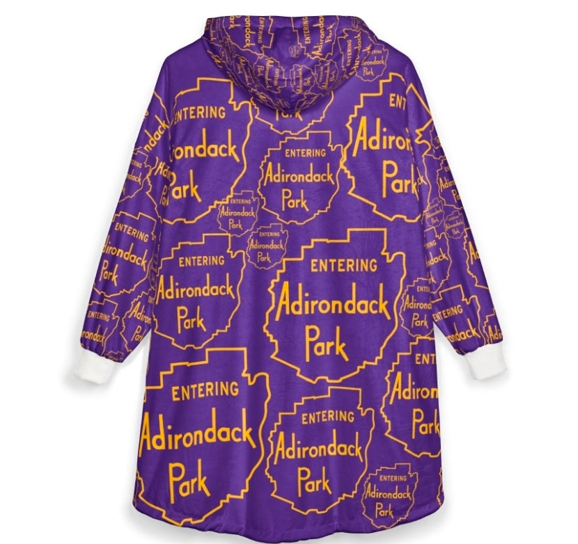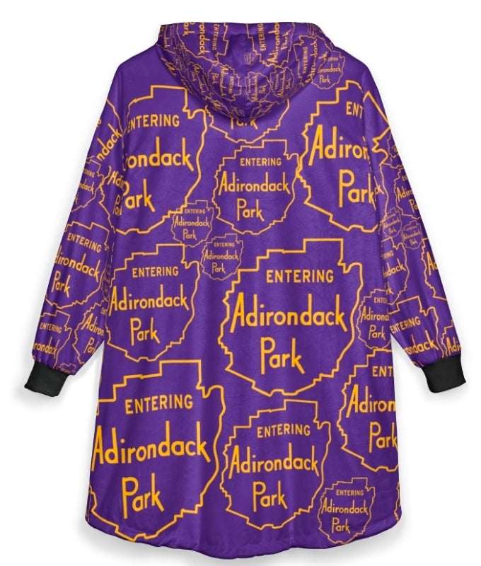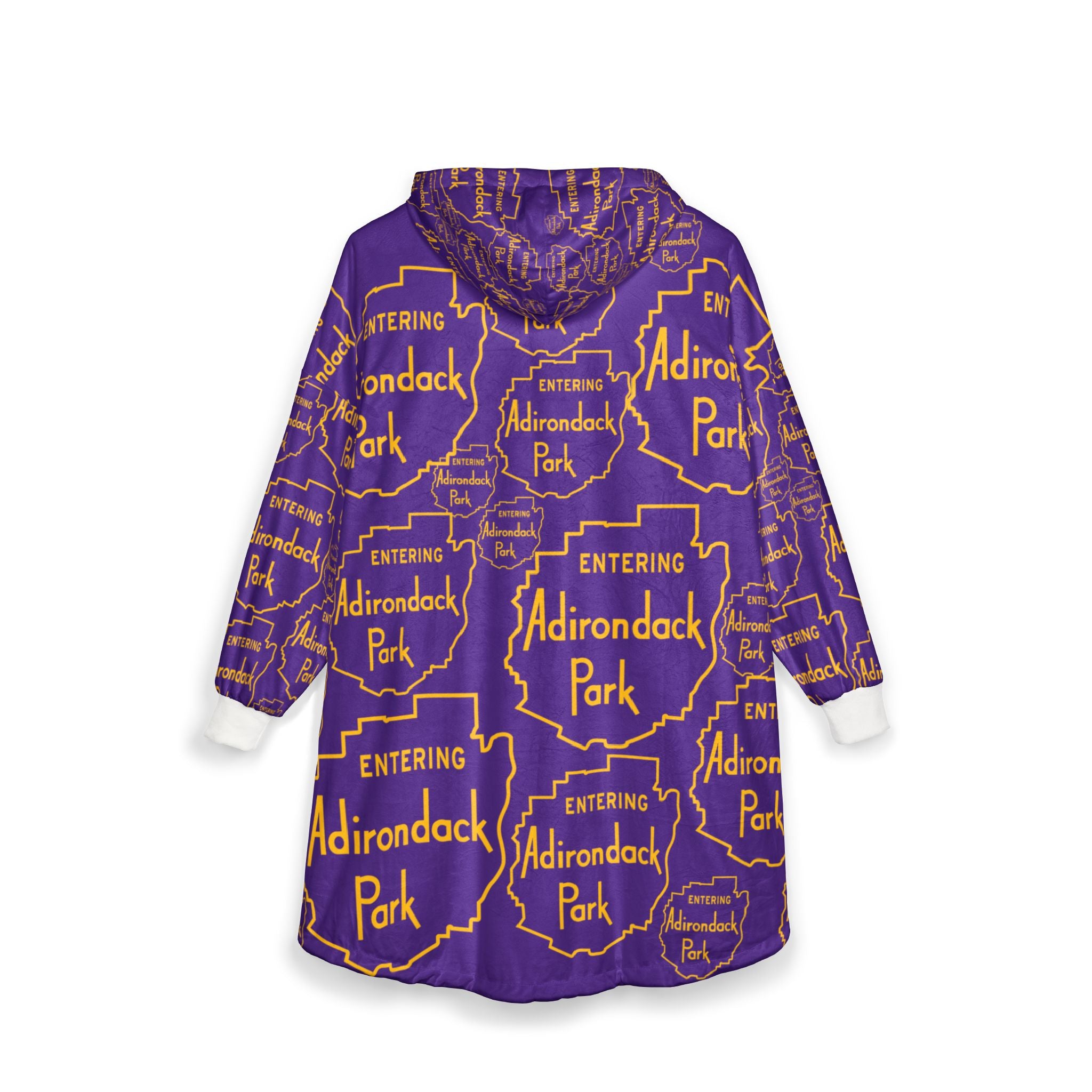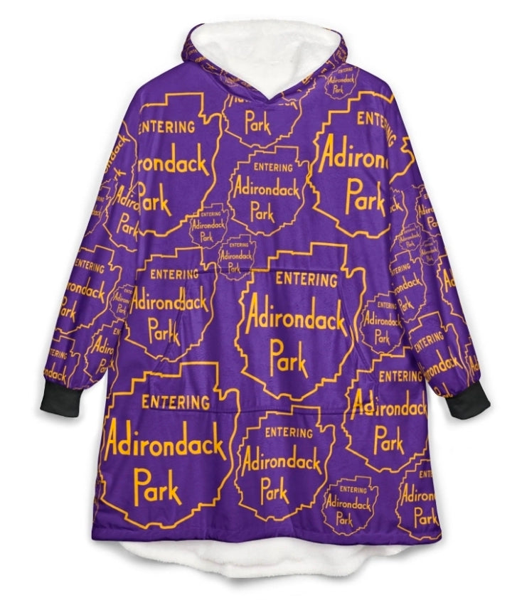 Wrap yourself in this Adirondack hooded blanket that reads like a well-worn trail map. Soft polyester fleece drapes easily over shoulders, the roomy kangaroo pocket holding snacks, a phone, or cold hands. The warm ochre print repeats a nostalgic “Entering Adirondack Park” motif—subtle, familiar, and quietly adventurous.