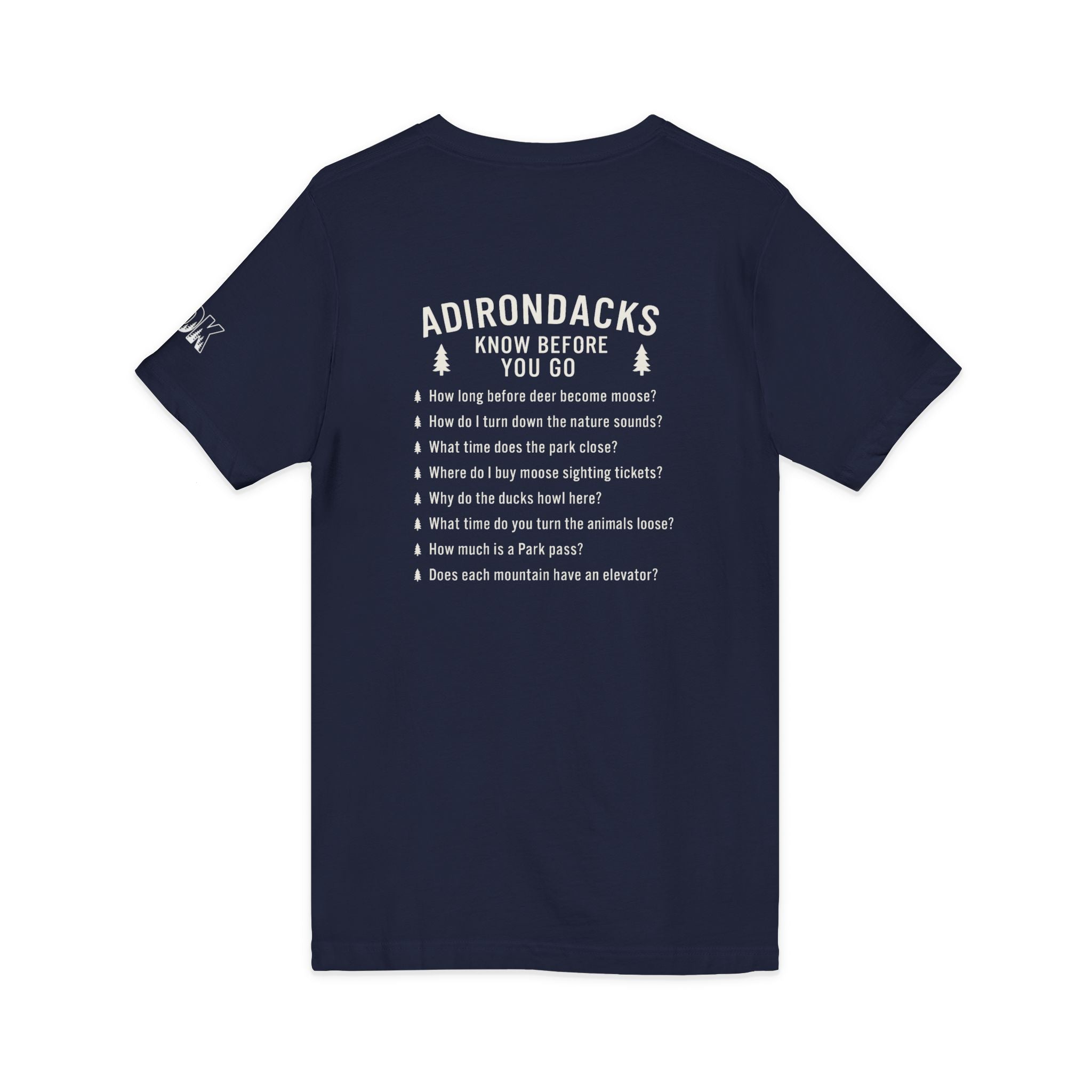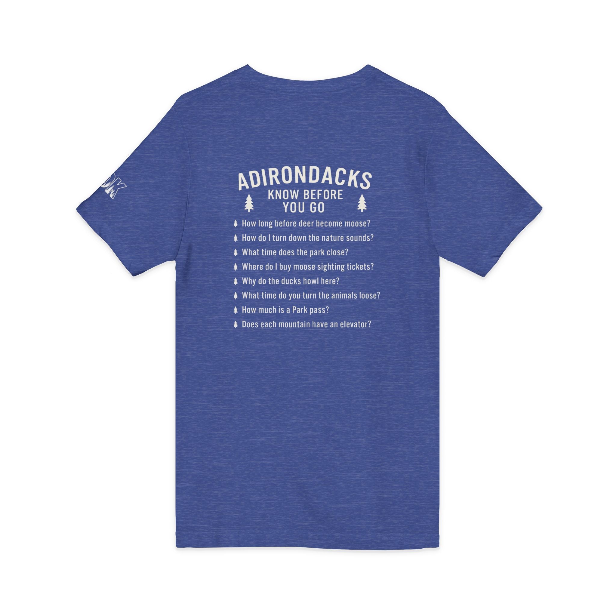 This Bella+Canvas lightweight unisex, V-neck tee brings easy movement and everyday comfort. The back of the shirt consists of the top questions asked to Life in the ADK. The soft cotton and heather blends drape cleanly across the retail fit, while side seams and shoulder tape keep the shape through hikes, errands, and campfire stories.