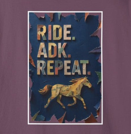 This Comfort Colors tshirt with Ride. ADK. Repeat. on the front and a horse graphic on the back is the perfect shirt for the Adirondack horse lover! This shirt has a relaxed fit and midweight cotton make this shirt an easy go-to for post-ride hangs, campsite coffee, or errands after a long day on the trail.