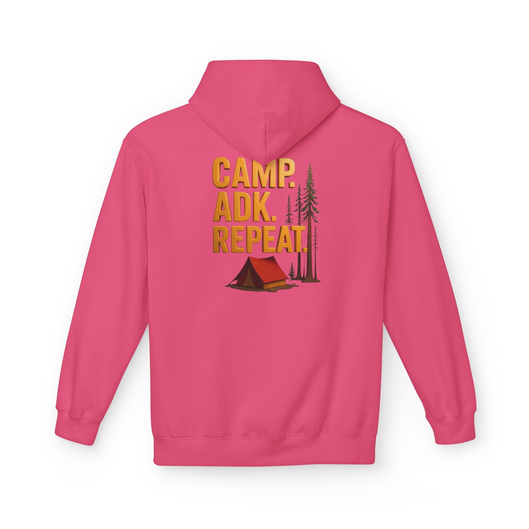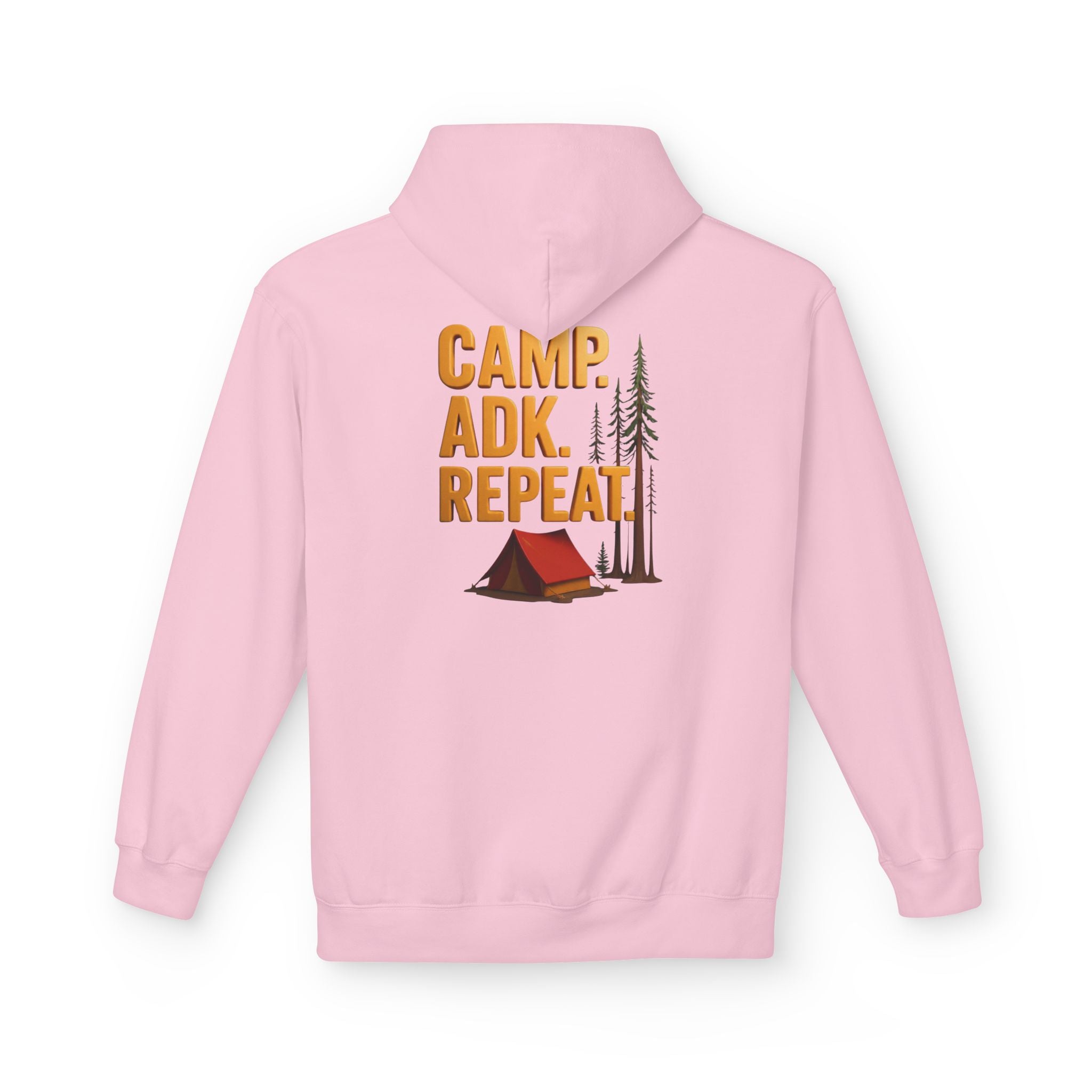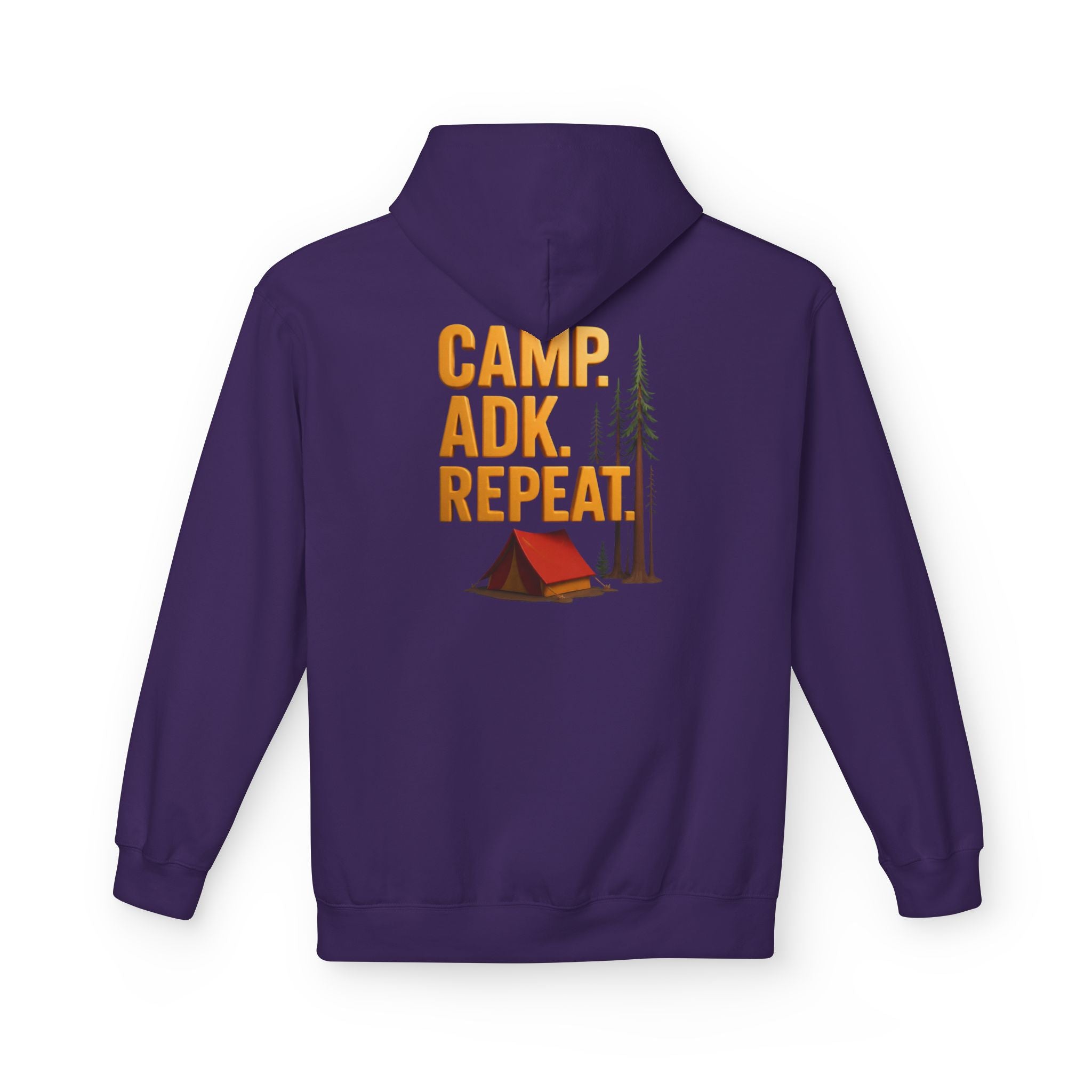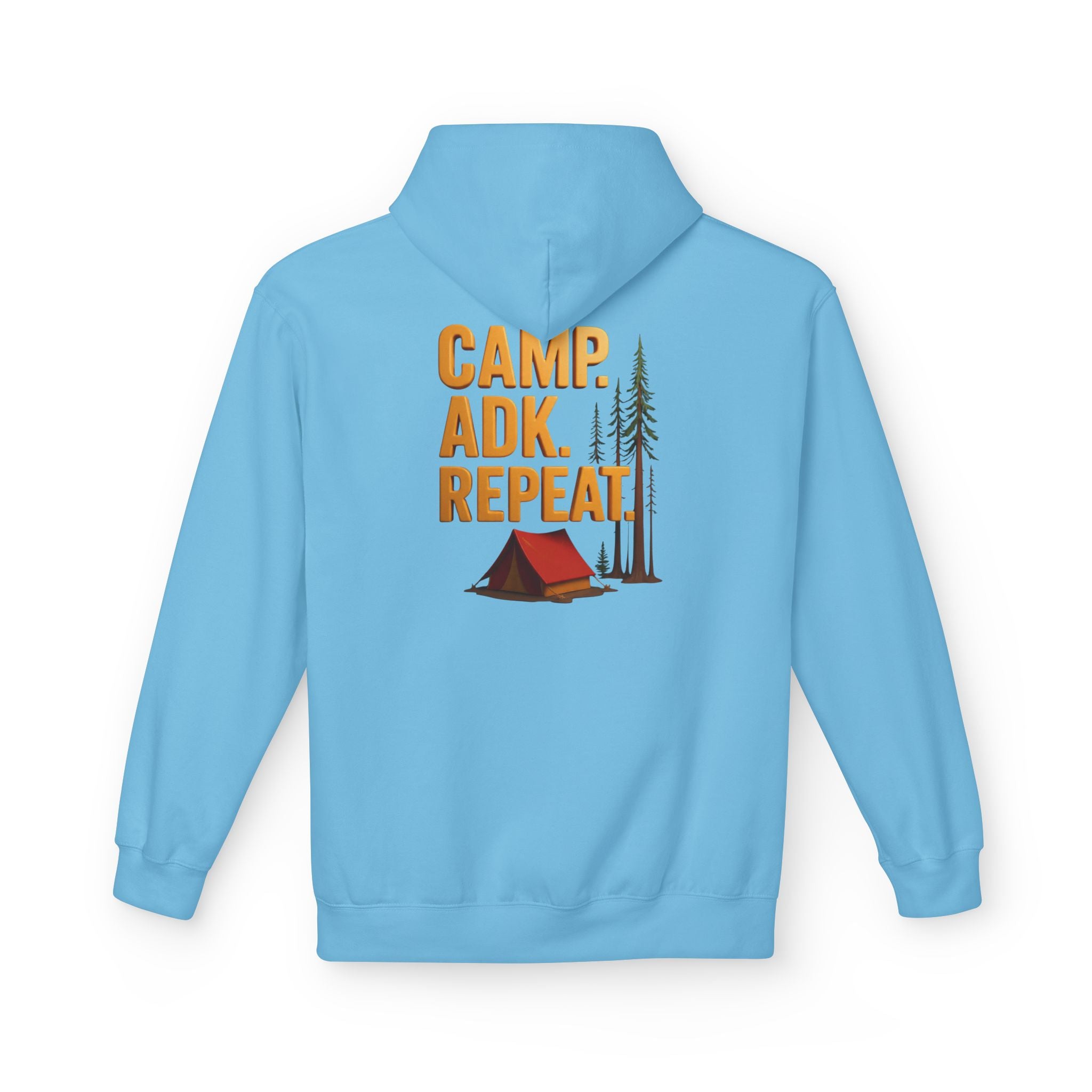 Persona;ize this Gildan camp hoodie with front and back designs. Front says CAMP. ADK. REPEAT. with your custom name, place, town, lake etc.. in the middle.