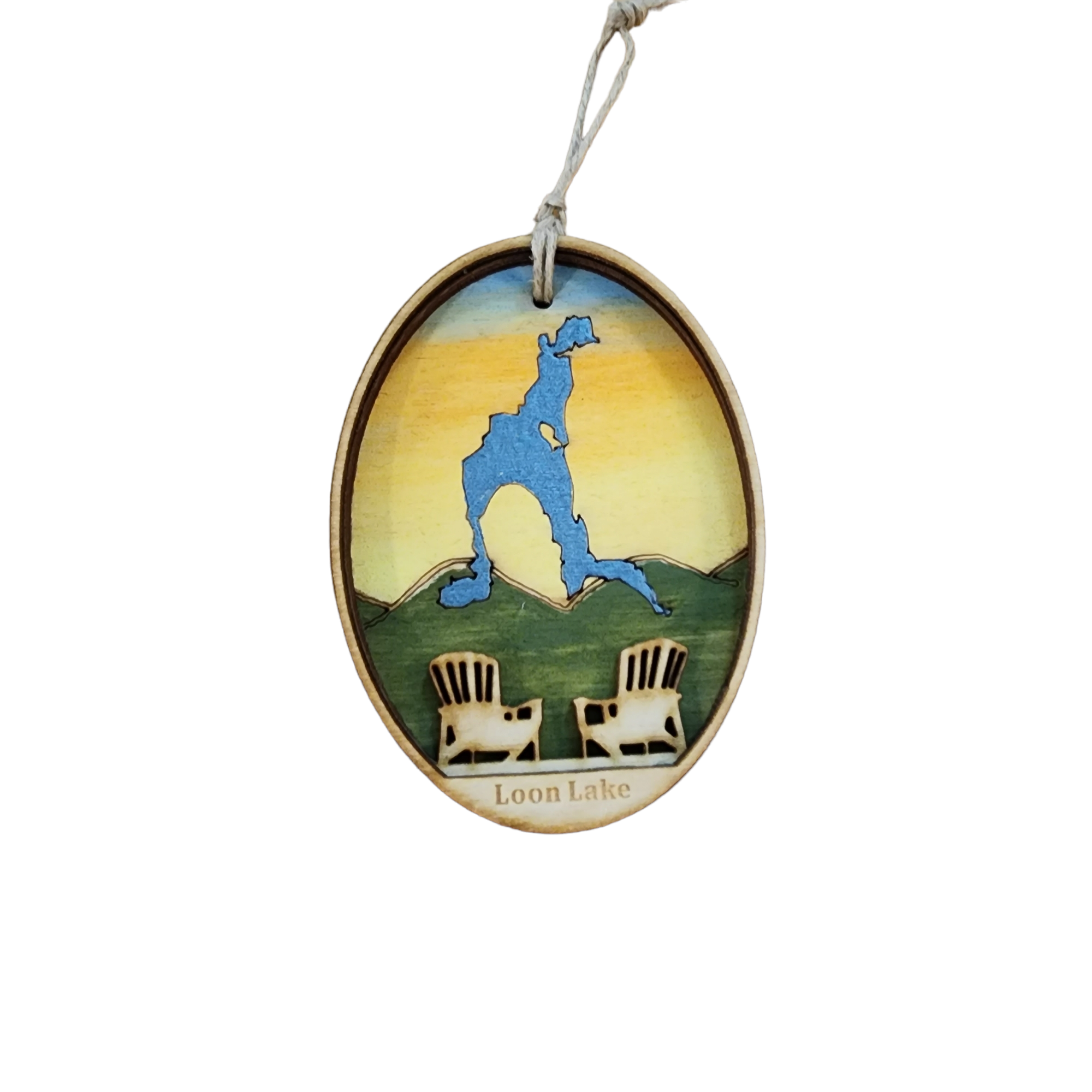 This ornament features Loon Lake, located in Warren County, NY. The first layer is the beautiful sky background with the lake painted in raised resin paint. The second layer is 2 Adirondack chairs overlooking the beautiful scenery and the third layer completes the ornament with the lake name etched into it.