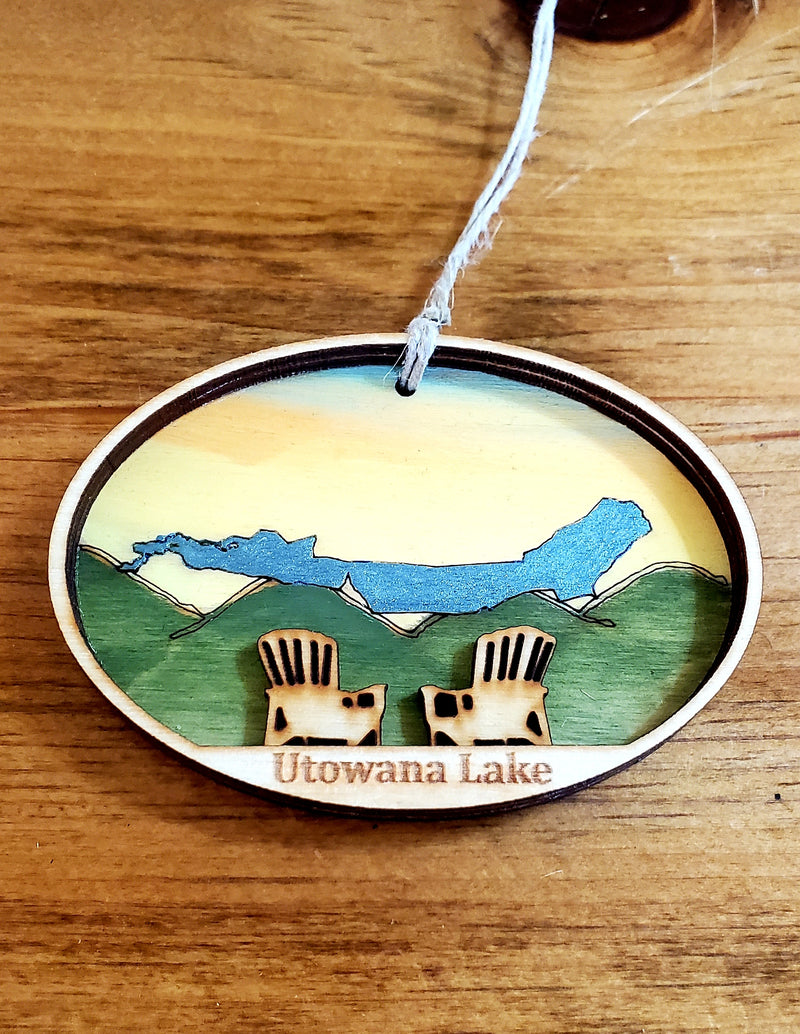 This ornament features Utowana Lake. The first layer is the beautiful sky background with the lake painted in raised resin paint. The second layer is 2 Adirondack chairs overlooking the beautiful scenery and the third layer completes the ornament with the lake name etched into it.